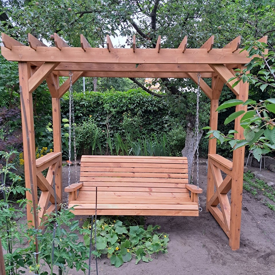 Bardzo ładny wygląd i wygoda. Huśtawka ma podstawę o wymiarach 2,4x1,2m, góra 2,7x1,5m, siedzisko 1,5m.