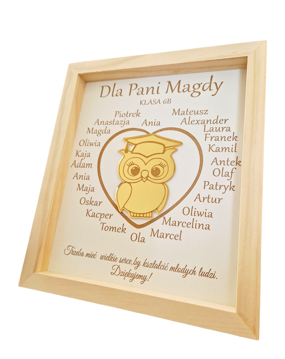 Jednym z najpiękniejszych pomysłów na prezent na Dzień Nauczyciela jest elegancka ramka o wymiarach 27,5 x 22 cm z praktyczną nóżką do postawienia. Jej centralnym elementem jest złota sowa z plexi, symbolizująca mądrość i wiedzę. Wokół sowy grawerowane są imiona dzieci, co czyni ramkę unikalną i osobistą pamiątką.