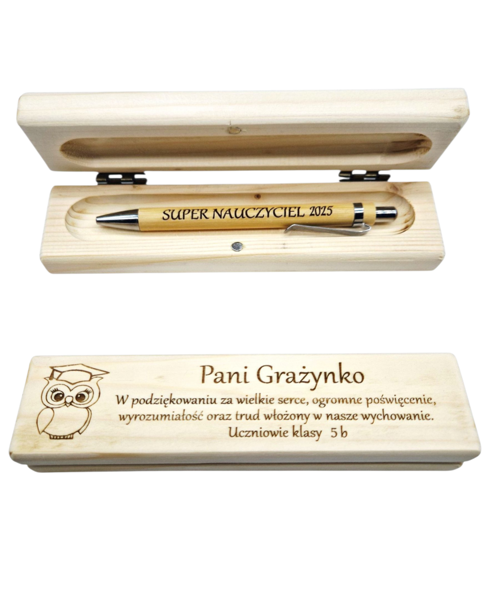 Bo to prezent z pomysłem i sercem! Drewniane pudełko można spersonalizować – dodać imię nauczyciela, krótką dedykację lub żartobliwy napis, który idealnie wpisze się w szkolny klimat.