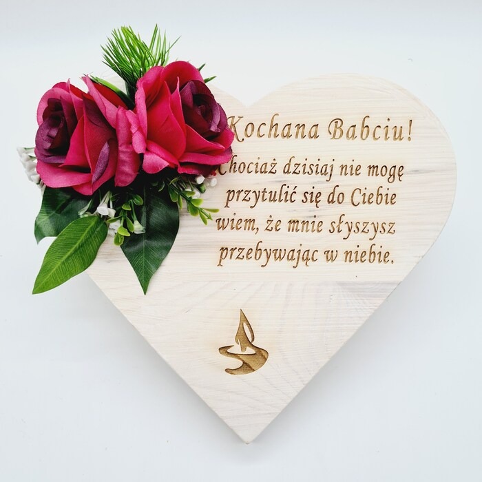 Każda z naszych kompozycji kwiatowych jest starannie dobierana, by pasować do drewnianej podstawy i tworzyć harmonijną całość. Co więcej, oferujemy możliwość personalizacji – na każdym sercu możemy wygrawerować wierszyk lub krótką dedykację, który będzie wyrazem Twoich uczuć i wdzięczności wobec zmarłej osoby.