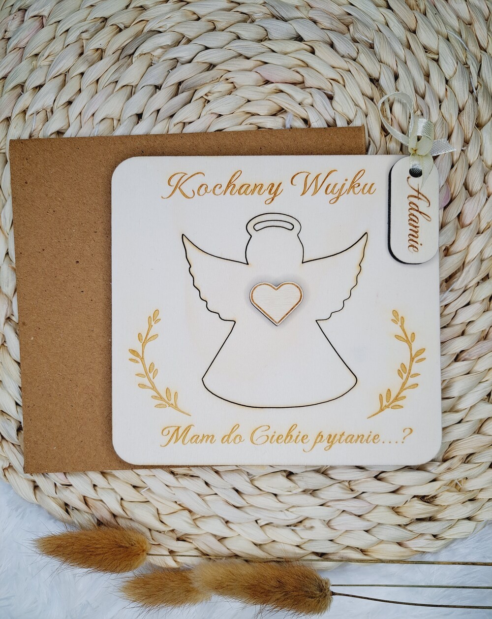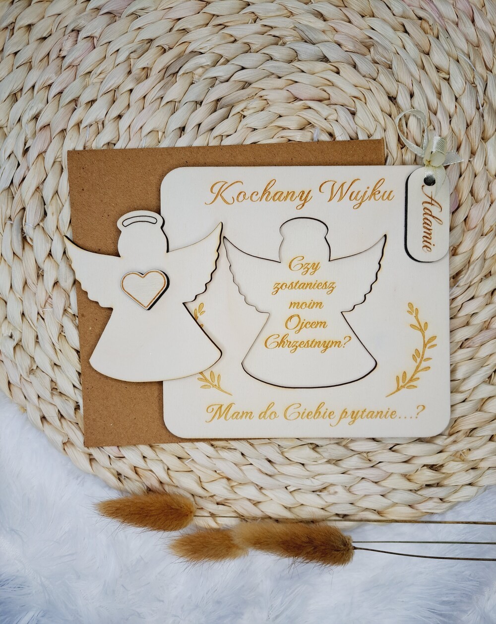 - Elegancki design: drewniana kartka z motywem aniołka wygląda stylowo i uroczo, co podkreśla wyjątkowość prośby.