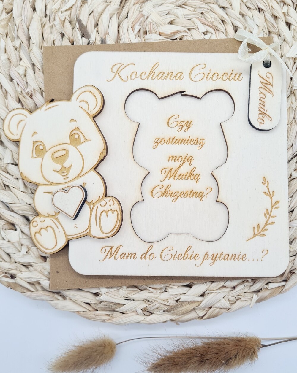 Nie zapomnij zapisać swojej personalizacji, aby móc dodać ją do koszykaPrzedstawiamy piękną wykonaną z drewnianej sklejki kartkę z grafiką misia, która na pewno wzruszy każdą ciocię i wujka. Ta starannie zaprojektowana kartka jest złożona z dwóch części. To idealna forma, aby uczynić moment, w którym ciocia lub wujek poczują się wyjątkowo. Przód kartki ozdobiony jest piękną grafiką misia, który wprowadza ciepły i uroczy akcent, idealny dla tak ważnej prośby. Pod grafiką misia znajduje się ukryte pytanie "Czy zostaniesz moją matką chrzestną ?" dla cioci lub "Czy zostaniesz moim ojcem chrzestnym? dla wujka. Podnosząc górną cześć odkrywamy zadane pytanie. Na górze kartki znajduje się napis "Kochana ciociu" lub "Kochany wujku", a na dole "Mam do Ciebie pytanie". W prawym górnym rogu umieszczone zostało imię osoby, do której jest adresowana kartka, dodaje to osobistego charakteru. W komplecie dołączona jest koperta, która dopełnia całość upominku.
