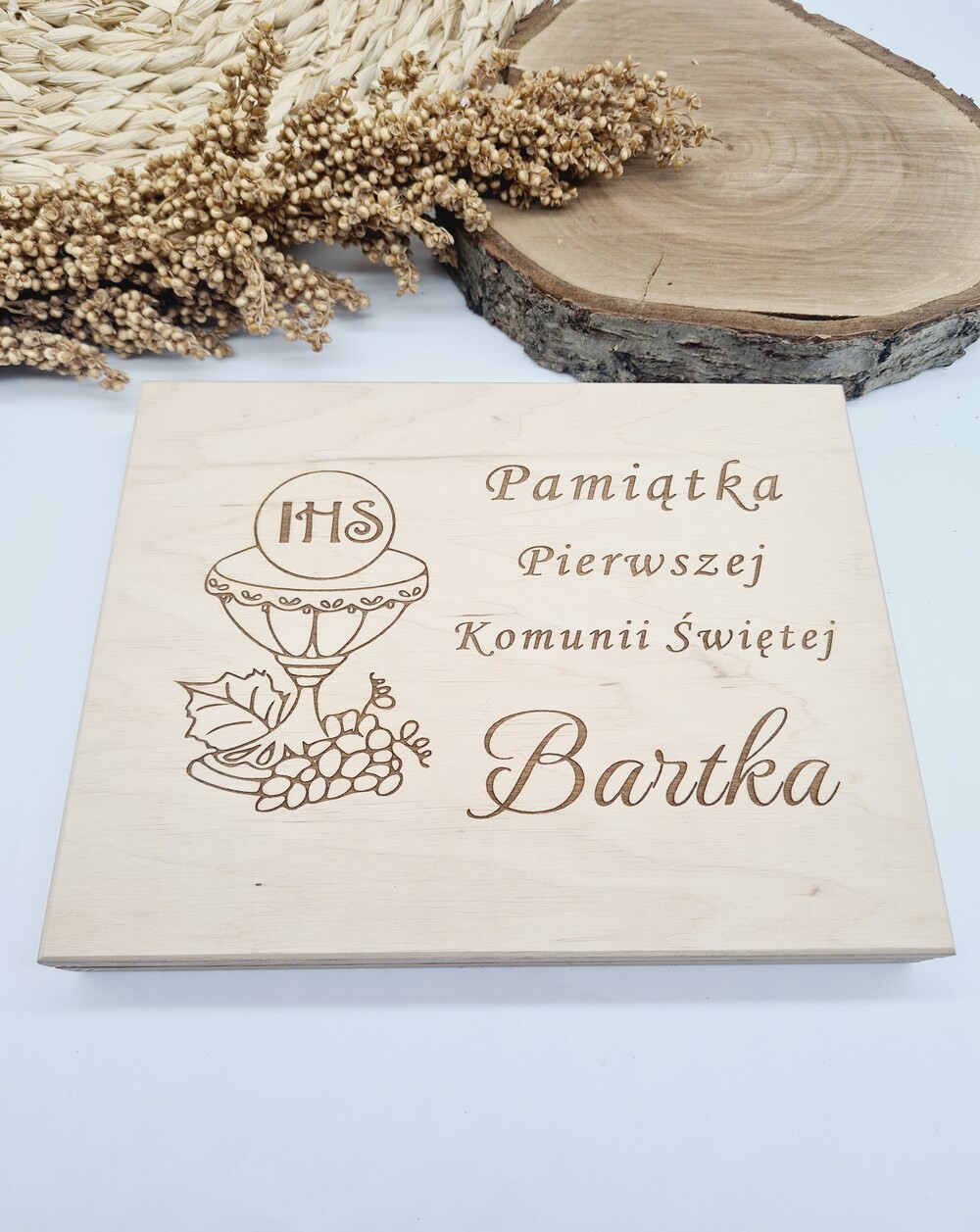 - Wyjątkowy design: drewniane pudełko z grafiką kielicha i hostii wygląda stylowo i elegancko, idealnie pasując do okazji Pierwszej Komunii Świętej.
