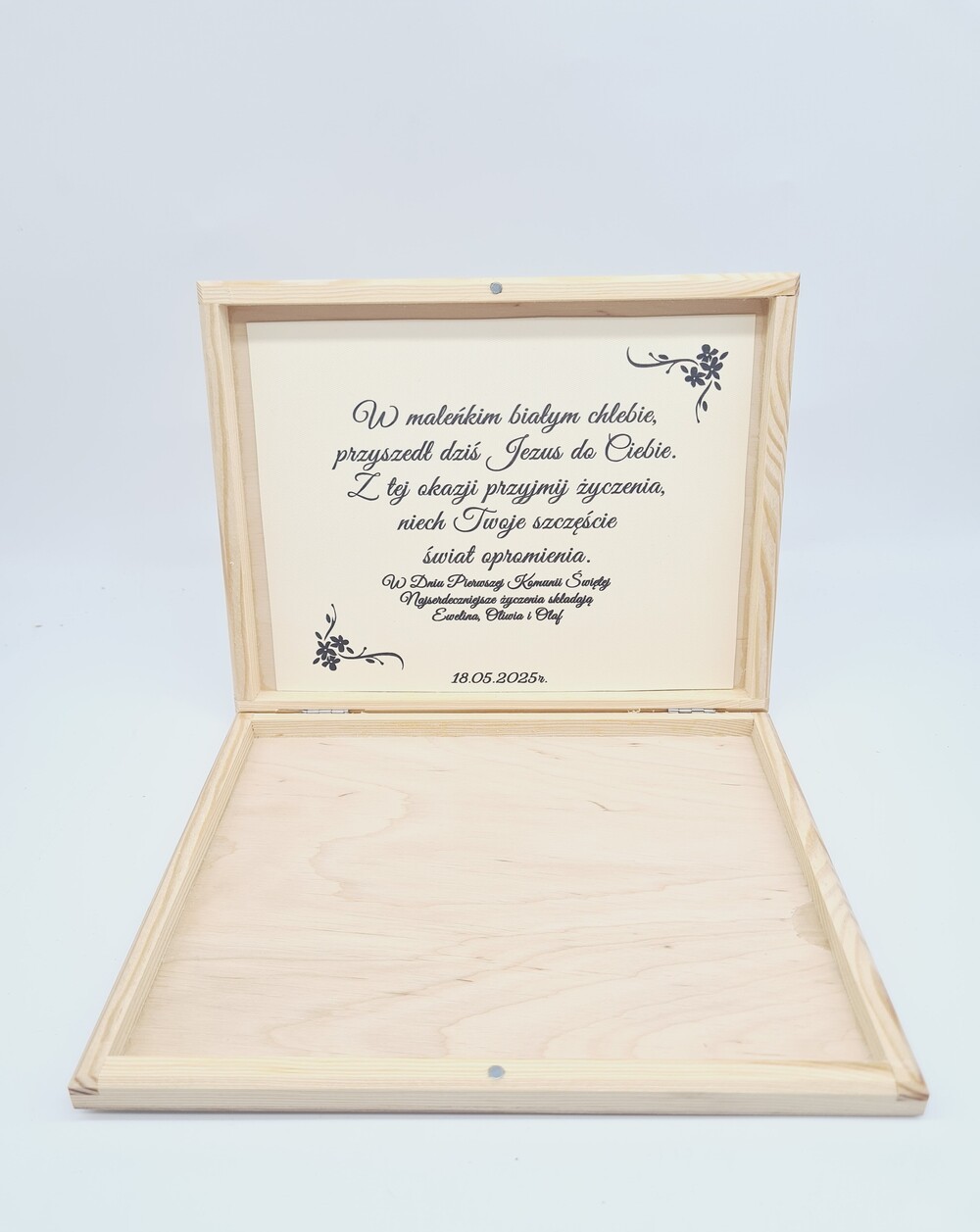 Nie zapomnij zapisać swojej personalizacji, aby móc dodać ją do koszykaDrewniane pudełko na Pamiątkę Pierwszej Komunii Świętej to nasza propozycja na wyjątkowy upominek. Nasze drewniane pudełko, nadaje się również do przekazania w nim pieniędzy jako prezent. Ta starannie wykonana pamiątka jest nie tylko piękna, ale również pełna symbolicznego znaczenia, co sprawia, że stanie się cenną pamiątką na całe życie. Pudełko wykonane z drewna oraz sklejki co nadaje mu elegancki i naturalny wygląd. Na wierzchu znajduje się piękna grafika kielicha z hostią oraz napis "Pamiątka Pierwszej Komunii Świętej" oraz imię dziecka przystępującego do Pierwszej Komunii Świętej. Wewnątrz pudełka znajdują się serdeczne życzenia.