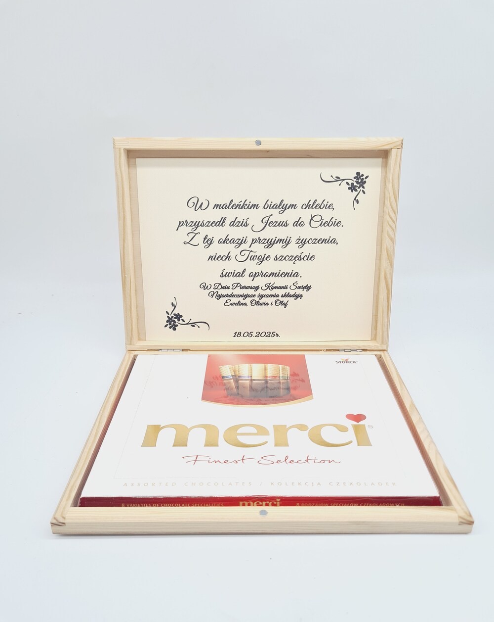 Pamiątka Komunii Świętej w formie pudełka. Pamiątka o wymiarach 21x17,5cm dlatego można w nim umieścić merci.