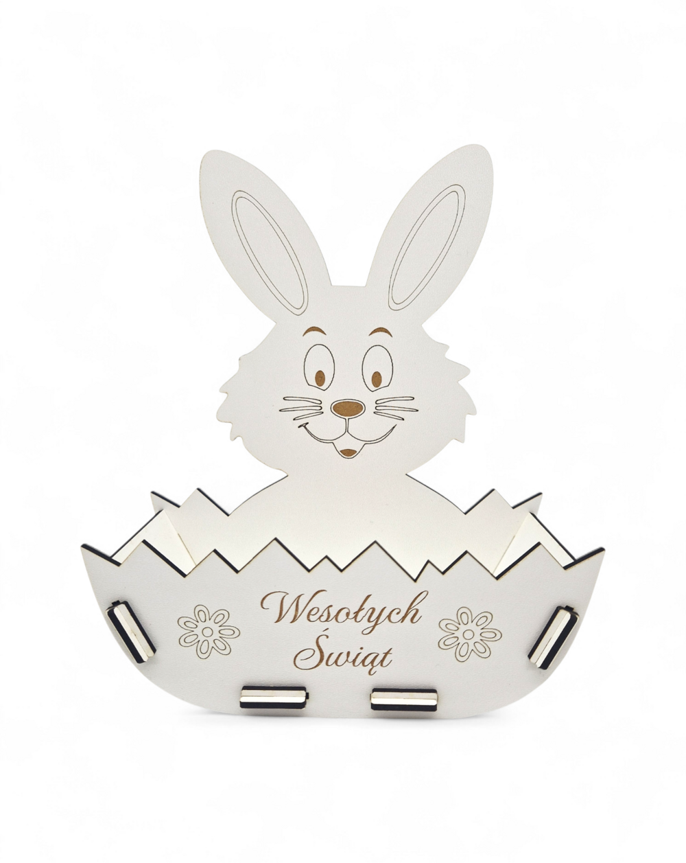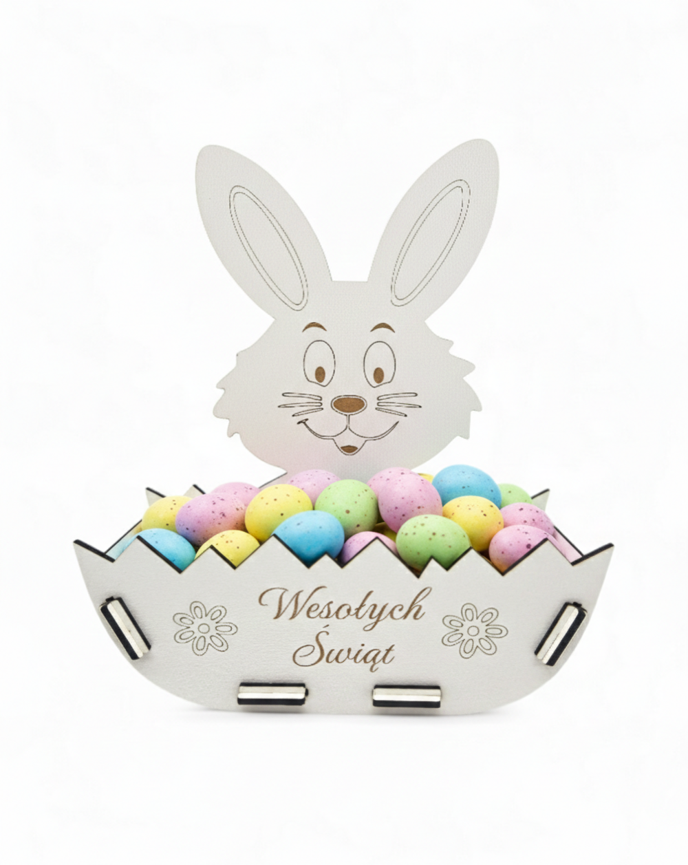 Koszyczek wielkanocny z motywem zajączka, wykonany z białej płyty HDF, to stylowy i praktyczny dodatek na święta. Dzięki solidnemu wykonaniu, estetycznemu designowi i odpowiednim wymiarom, koszyczek ten doskonale nadaje się do przechowywania słodyczy i upominków, jednocześnie stanowiąc piękną dekorację wielkanocną. Płyta HDF jest łatwa do grawerowania i cięcia, co pozwala na stworzenie precyzyjnych wzorów i kształtów. Na tylnej części koszyczka znajduje się uroczysty motyw zajączka wielkanocnego. Zajączek, symbolizujący radość i wiosenne odrodzenie, jest wycięty i wygrawerowany z dużą dbałością o szczegóły. Jego wizerunek nadaje koszyczkowi przyjazny i świąteczny charakter. Na przedniej części wygrawerowany napis "Wesołych Świąt" co nadaje świątecznego uroku. Koszyczek ma odpowiednią wielkość, aby pomieścić różne słodycze, czekoladowe jajka, małe upominki czy inne wielkanocne przysmaki. Jego wymiary pozwalają na wygodne umieszczenie zawartości, a jednocześnie pozostają kompaktowe, co ułatwia transport i przechowywanie. Koszyczek może służyć jako świąteczny pojemnik na prezenty, zarówno dla dzieci, jak i dorosłych. Jest idealny na czekoladowe jajka, cukierki, a także na drobne upominki takie jak biżuteria, małe zabawki czy rękodzieło. Może również pełnić funkcję dekoracyjną, ozdabiając stół wielkanocny lub inne miejsce w domu, wprowadzając świąteczną atmosferę.