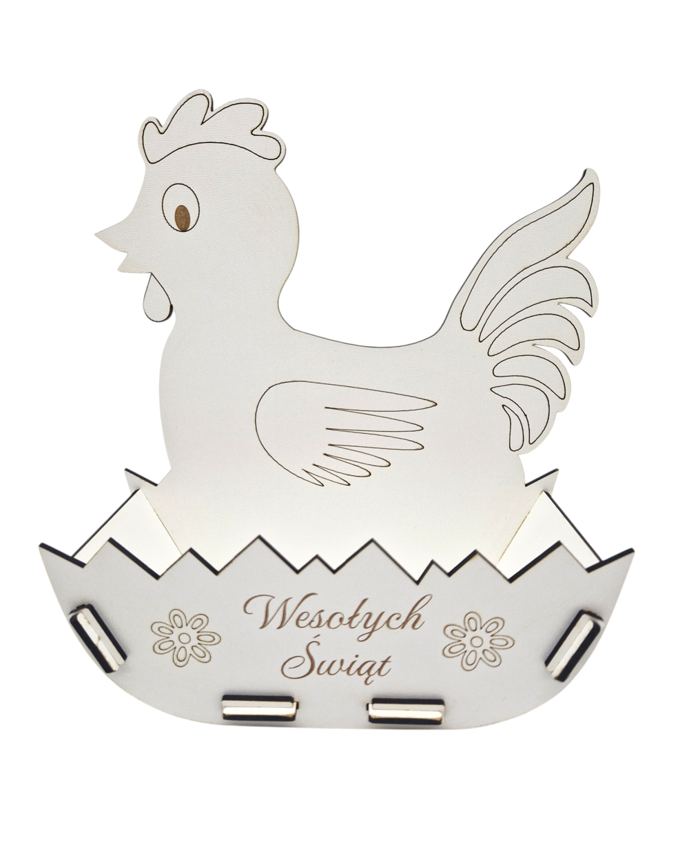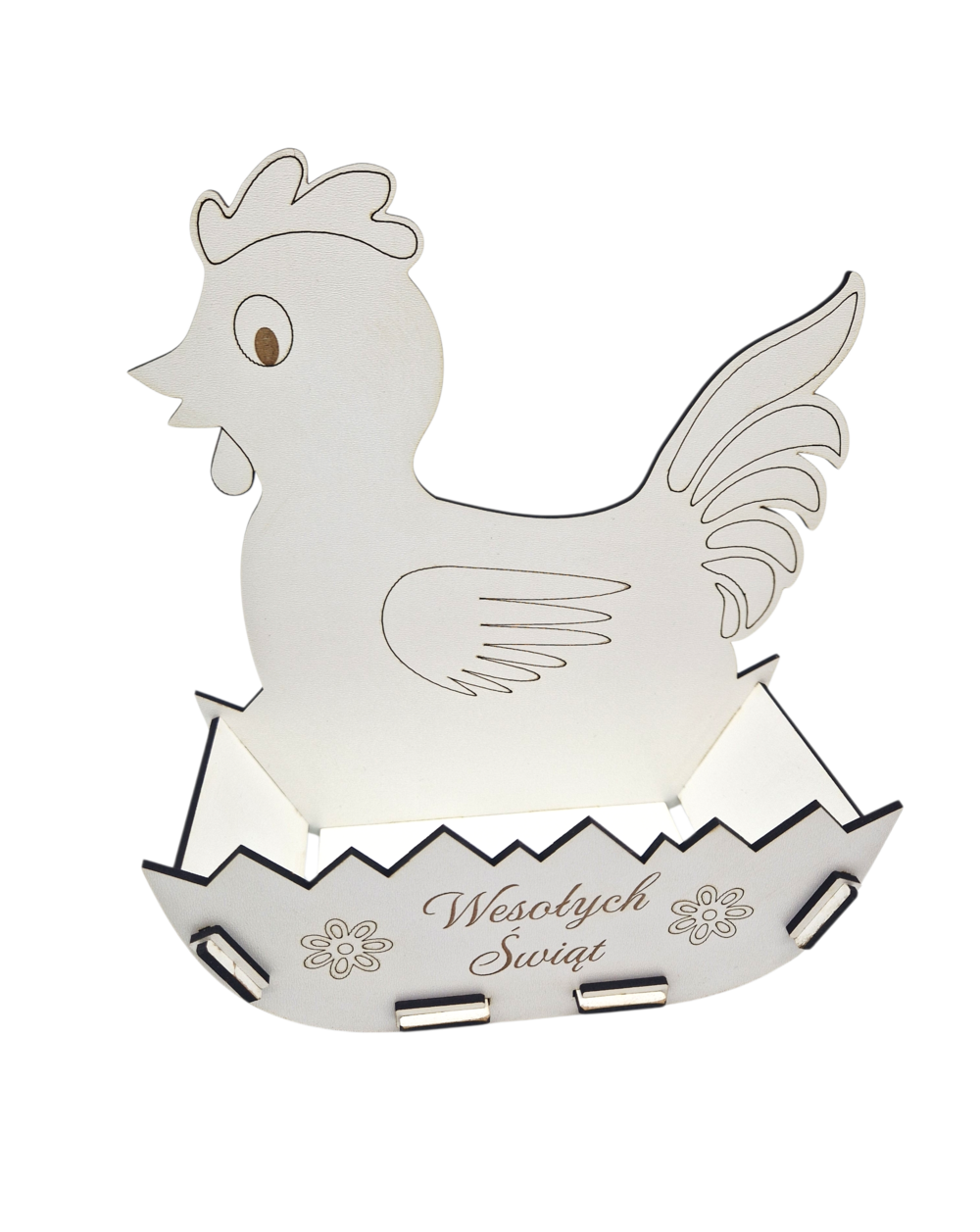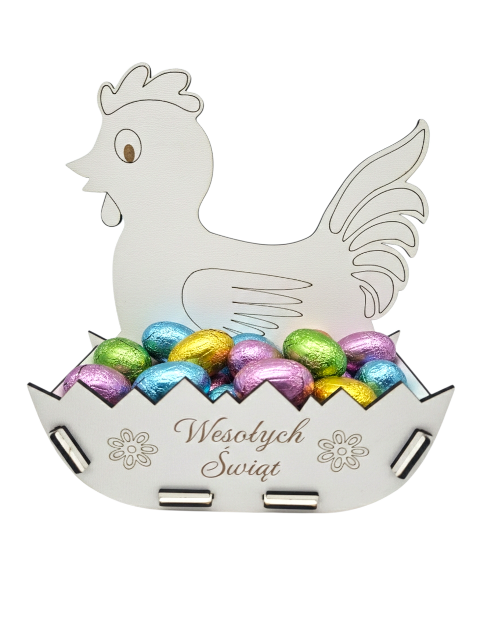 Koszyczek z białej płyty HDF z motywem kury i żonkili to elegancka i funkcjonalna dekoracja wielkanocna. Starannie wykonany, z estetycznym grawerem i przemyślanym designem, doskonale nadaje się na prezent lub jako część dekoracji świątecznej. Jego wymiary i konstrukcja czynią go praktycznym i łatwym do wykorzystania w różnorodny sposób, co sprawia, że jest uniwersalnym elementem świątecznej aranżacji. Koszyczek wykonany jest z białej płyty HDF , co zapewnia mu trwałość i estetyczny wygląd. Płyta HDF jest popularnym wyborem ze względu na swoją wytrzymałość oraz możliwość precyzyjnego grawerowania i cięcia. Na przedniej stronie koszyczka wygrawerowano napis "Wesołych Świąt", który jest centralnym elementem dekoracyjnym. Napis ten wprowadza świąteczny nastrój i sprawia, że koszyczek jest idealnym dodatkiem na Wielkanoc. Obok napisu znajdują się wygrawerowane kwiatki, które są symbolem wiosny i odrodzenia. Na tylnej stronie koszyczka umieszczono wyciętą i wygrawerowaną postać kury wielkanocnej. Kura jest symbolem płodności i odradzania się życia, co idealnie pasuje do tematyki świąt wielkanocnych. Detale grawerowania dodają uroku i oryginalności. Koszyczek jest wystarczająco duży, aby pomieścić różne słodycze, czekoladowe jajka, małe upominki czy inne świąteczne akcesoria. Jego kompaktowe wymiary ułatwiają przechowywanie i transport, co jest szczególnie przydatne, jeśli koszyczek ma być częścią większej dekoracji lub prezentu. Koszyczek idealnie nadaje się na prezent, do którego można włożyć słodycze, małe zabawki, ozdoby wielkanocne czy inne drobne upominki. Może również służyć jako dekoracja stołu wielkanocnego, wprowadzając świąteczny nastrój do wnętrza.