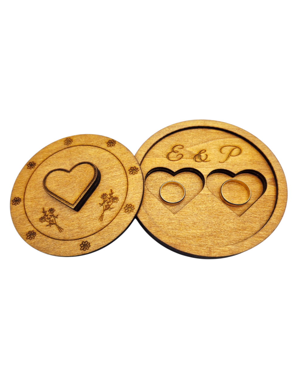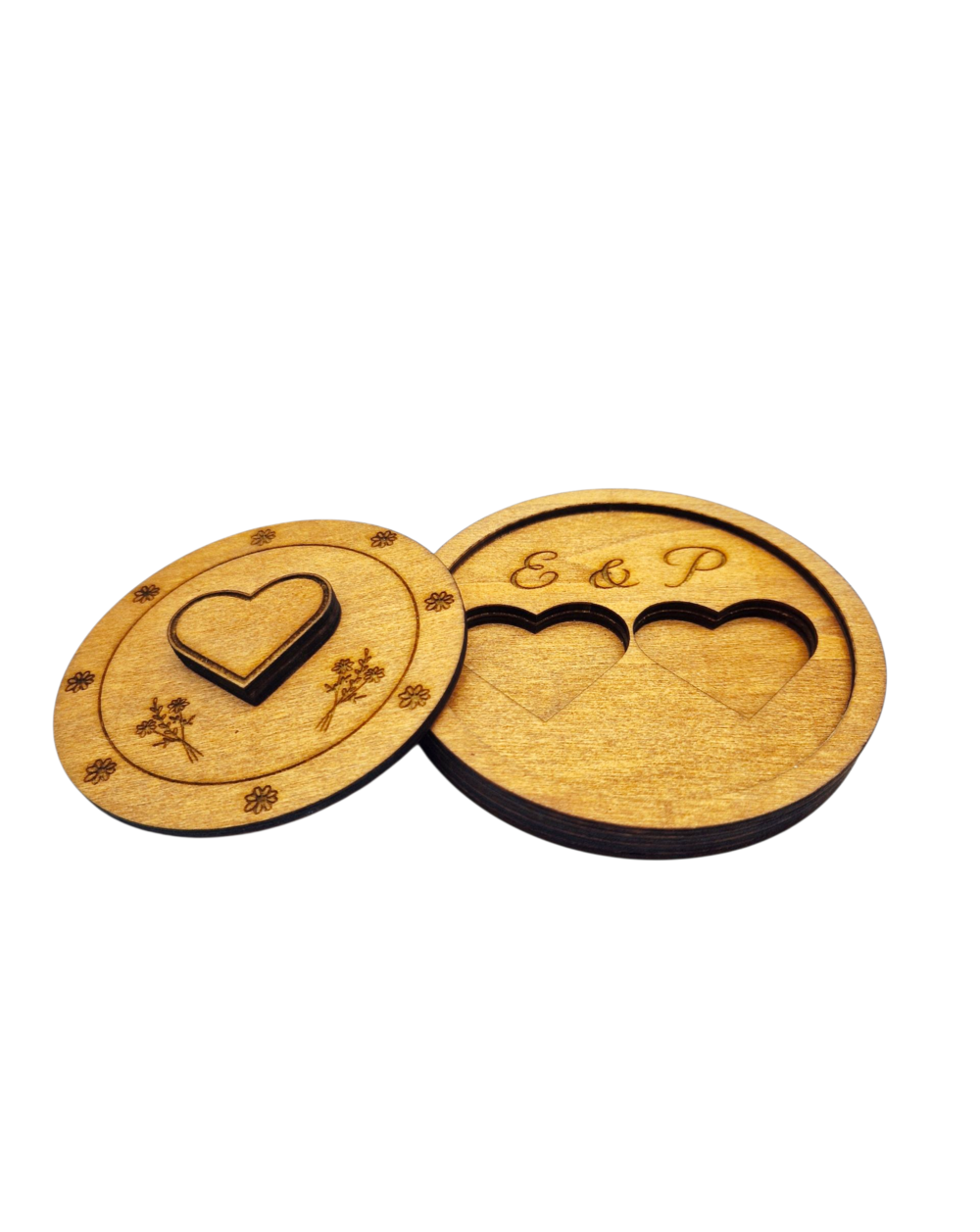 Nie zapomnij zapisać swojej personalizacji, aby móc dodać ją do koszykaPudełko na obrączki z drewnianej sklejki, z inicjałami pary młodej i delikatną grafiką kwiatków, to nie tylko praktyczny, ale i piękny dodatek do ceremonii ślubnej. Świetnie nadaje się do sesji fotograficznych jako gadżet do zdjęć. Jego naturalny wygląd, połączony z personalizowanymi elementami, czyni go wyjątkowym i pełnym znaczenia. To doskonała pamiątka, która po ślubie może służyć jako elegancka szkatułka na biżuterię przypominając o wyjątkowym dniu. Pudełko na obrączki wykonane jest z drewnianej sklejki, co nadaje mu naturalny, rustykalny wygląd, idealnie wpisujący się w romantyczną estetykę ślubną. Pudełko ma kształt okrągły o średnicy 12 cm, co czyni je wystarczająco dużym, aby pomieścić obrączki, a jednocześnie na tyle kompaktowym, by łatwo było je trzymać i przechowywać. Na wieczku pudełka wygrawerowane są inicjały pary młodej oraz subtelna grafika kwiatków, co dodaje mu elegancji i personalizowanego charakteru. Kwiatowe motywy są delikatne i klasyczne, doskonale pasujące do różnych stylów ślubnych. Na wieczku znajduje się również małe, doczepione serce, które służy jako uchwyt do otwierania pudełka. To serce nie tylko pełni funkcję praktyczną, ale także dodaje uroku i symbolizmu całej kompozycji. W środku pudełka znajdują się dwa wycięte serca, które stanowią miejsca na obrączki. Te wycięcia są zaprojektowane tak, aby delikatnie przytrzymać obrączki, eksponując je w sposób elegancki i bezpieczny.