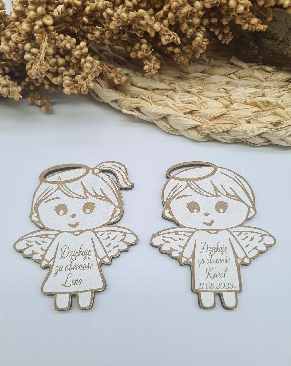 Magnes w formie podziękowana dla gości w kształcie aniołka dziewczynka lub chłopiec w zależności od płci dziecka.