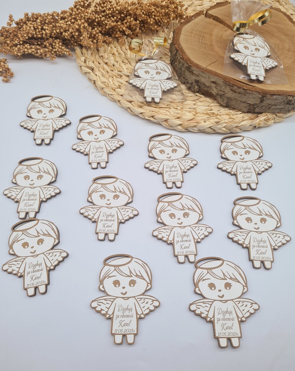 Nie zapomnij zapisać swojej personalizacji, aby móc dodać ją do koszykaMagnes w kształcie aniołka to doskonały sposób na wyrażenie wdzięczności gościom za ich obecność podczas ważnych uroczystości Twojego dziecka. Jest to piękny, personalizowany upominek, który na długo zostanie w pamięci. Magnesy te doskonale nadają się na różne uroczystości związane z dziećmi, takie jak chrzest, Pierwsza Komunia Święta, czy inne ważne wydarzenia. Dzięki możliwości dodania imienia dziecka, magnes staje się wyjątkowym i osobistym upominkiem. Wykonane z białej płyty HDF, magnesy są eleganckie i estetyczne. Ich praktyczny charakter sprawia, że będą miłym wspomnieniem dla obdarowanych, przypominającym o wyjątkowym dniu.