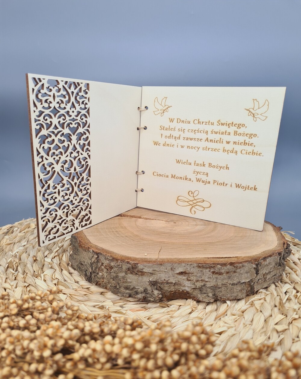 Kartka z drewnianej sklejki to wyjątkowa propozycja na pamiątkę z okazji Chrztu Świętego.
