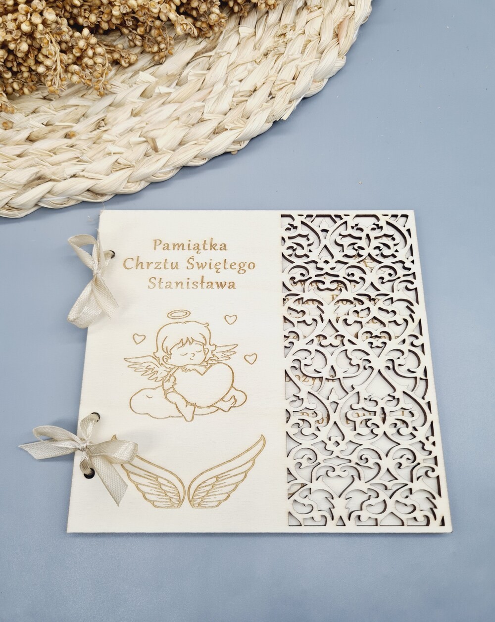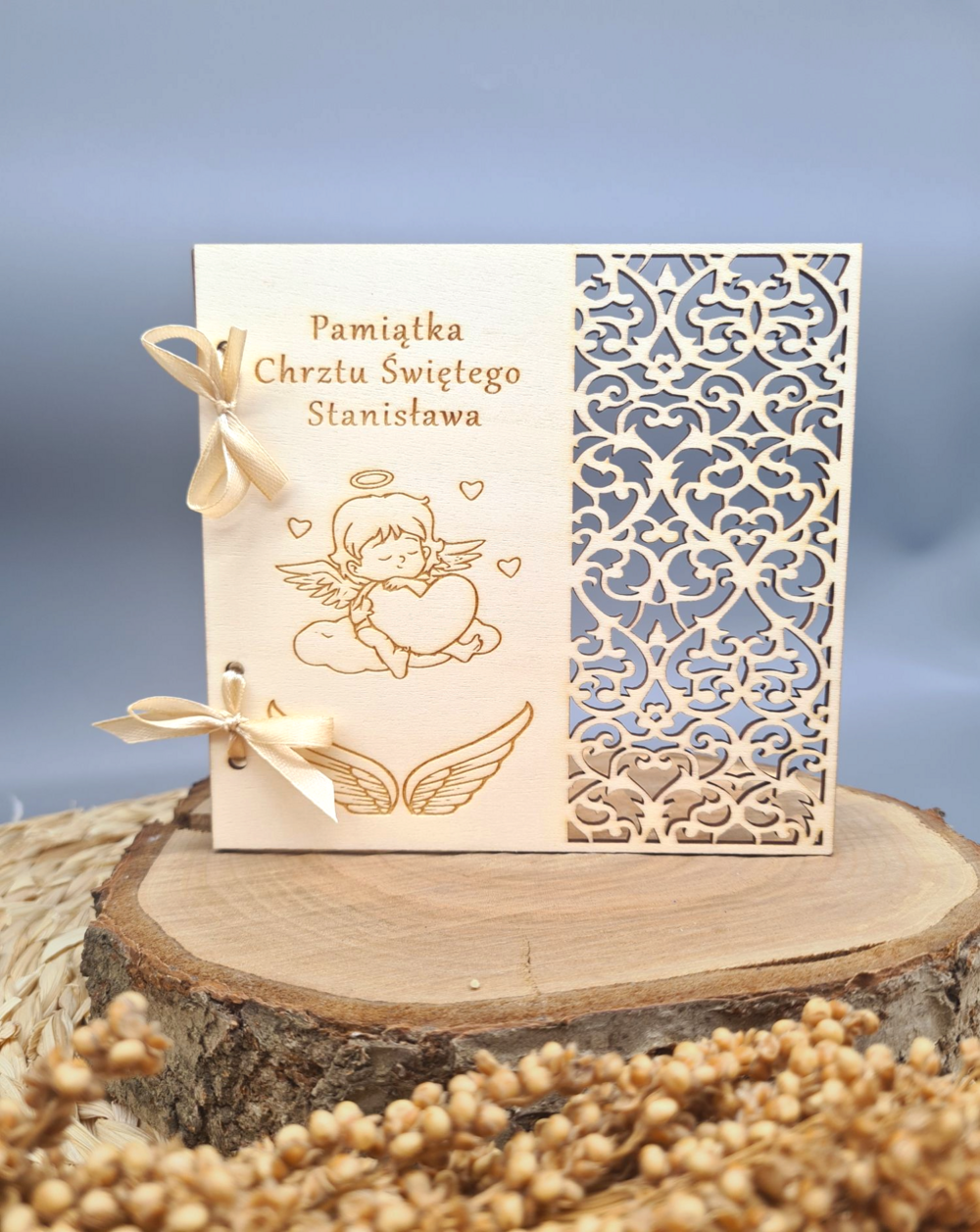 Nie zapomnij zapisać swojej personalizacji, aby móc dodać ją do koszykaDrewniana kartka na chrzest, którą prezentujemy, jest wyjątkowym i eleganckim upominkiem, idealnym na tę szczególną okazję. Kartka wykonana jest z wysokiej jakości sklejki drewnianej, nadając jej naturalności oraz rustykalnego wyglądu, jednocześnie podkreślając wyjątkowość wydarzenia. Przednia część kartki zdobiona jest piękną grafiką przedstawiającą aniołka. Aniołek ma delikatne estetyczne rysy, które dodają kartce lekkości i subtelności. Całość dopełnia po boku kartki ażurowy akcent, który dodaje elegancji i wyjątkowości. W środku kartki znajdują się życzenia: