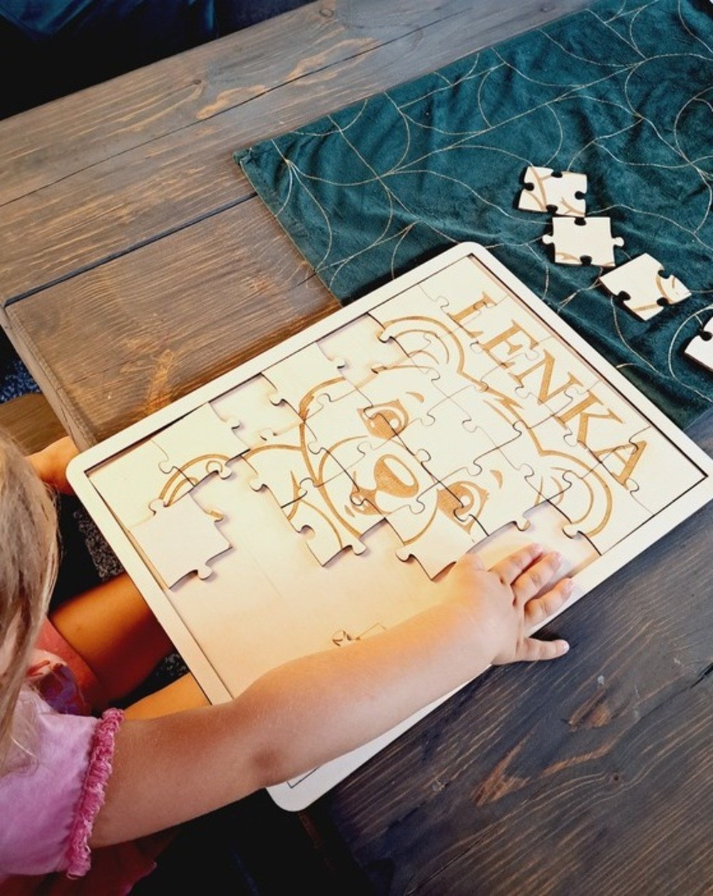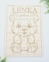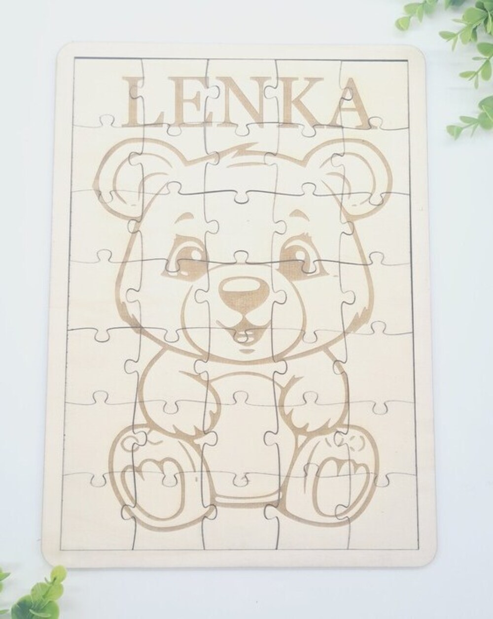 Personalizowane imieniem puzzle oraz obrazem misia wykonane z drewnianej sklejki to piękny naturalny upominek dla dzieci.