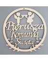 Przedstawiamy obręcz o średnicy około 40 cm, wykonaną ze sklejki. W centralnej części znajduje się napis „Pierwsza Komunia Święta” w eleganckiej czcionce. Wokół napisu oraz na krawędzi obręczy rozmieszczone są delikatne listki oraz sylwetki aniołków. To wspaniała ozdoba sali lub domu podczas uroczystości Pierwszej Komunii Świętej.