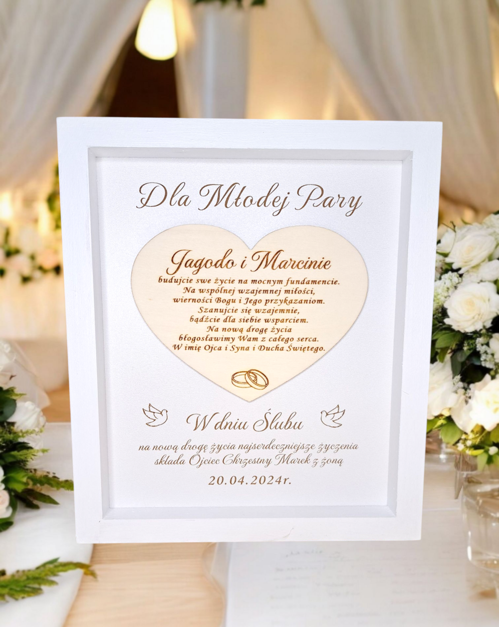 Nie zapomnij zapisać swojej personalizacji, aby móc dodać ją do koszykaPamiątka ślubna w pięknej białej drewnianej ramce to idealny upominek dla Młodej Pary. To również niezwykła ozdoba, która doda uroku wnętrzu nowożeńców. Dodatkowo stanowi doskonałą pamiątkę na całe życie, przypominającą o miłości i wspólnym starcie w nowe życie. Na środku ramki umieszczone piękne naturalne drewniane serduszko z wygrawerowanymi życzeniami, wzbogacone o subtelny akcent w postaci obrazka z obrączkami i gołąbkami. To piękne połączenie symbolizuje miłość i jedność, tworząc w całości wyjątkowy upominek dla Młodej Pary.