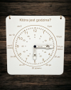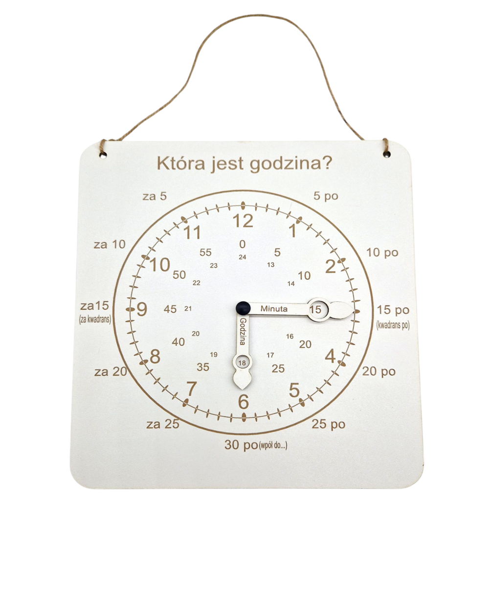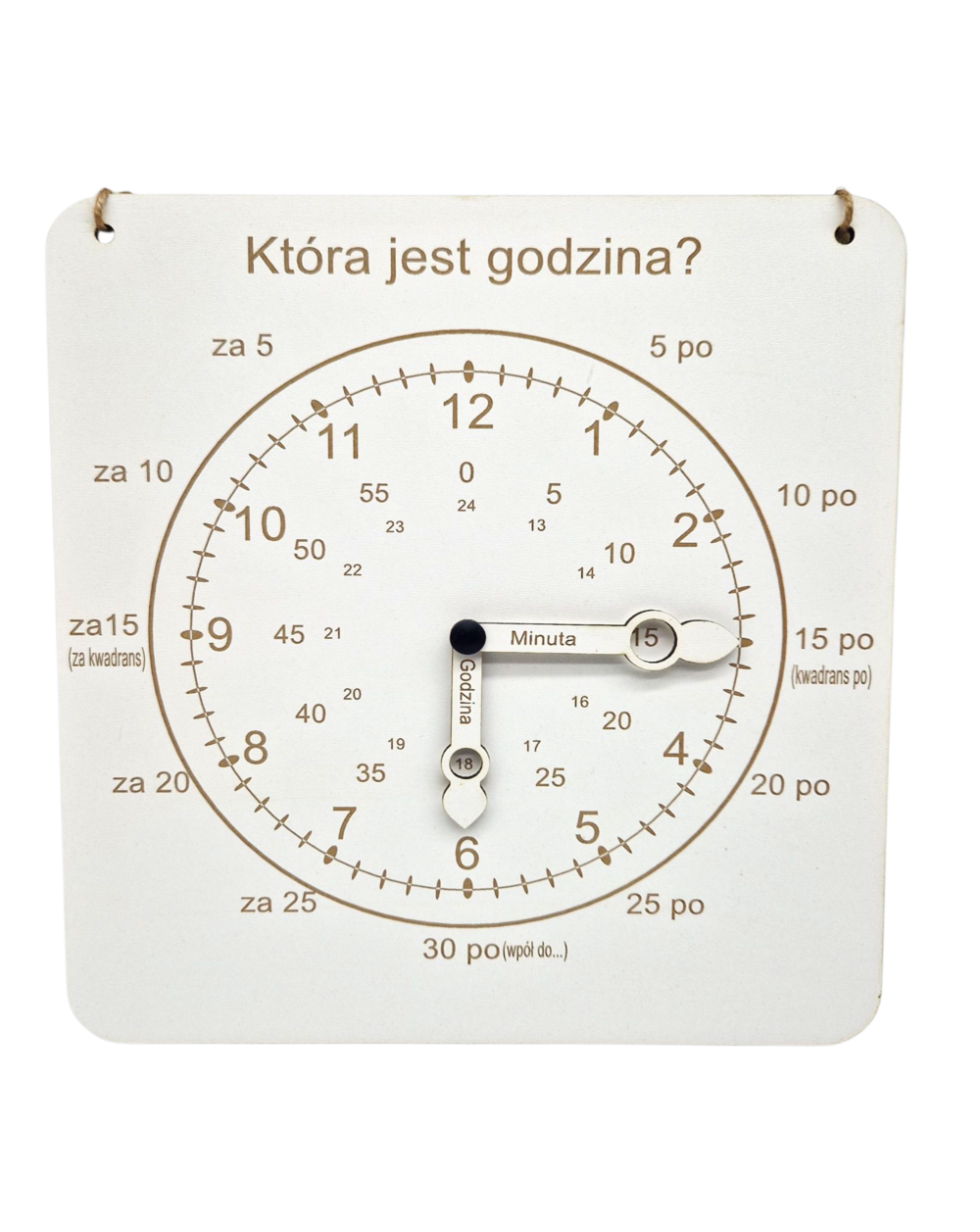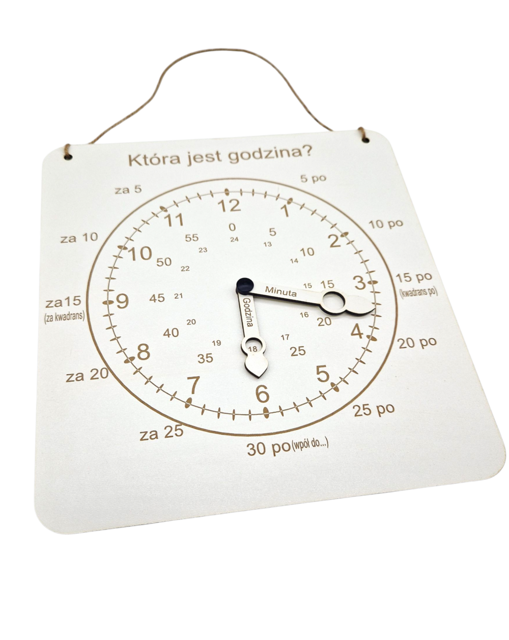 Zegar wykonany jest z trwałej i estetycznej białej płyty HDF. To materiał kompozytowy o wysokiej gęstości, który charakteryzuje się dużą odpornością na uszkodzenia mechaniczne i idealnie nadaje się do precyzyjnego cięcia, co zapewnia estetyczny wygląd produktu. Na górze zegara znajduje się napis "Która jest godzina?", który jest wyraźny i czytelny, wykonany czarną, kontrastową czcionką. Napis pełni funkcję edukacyjną, zachęcając dzieci do nauki odczytywania godzin. Zegar wyposażony jest w ruchome wskazówki: