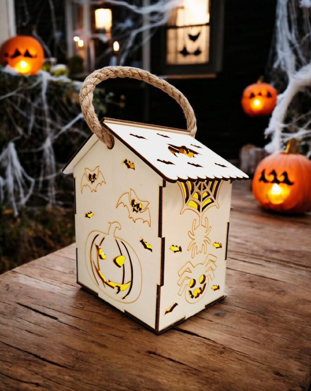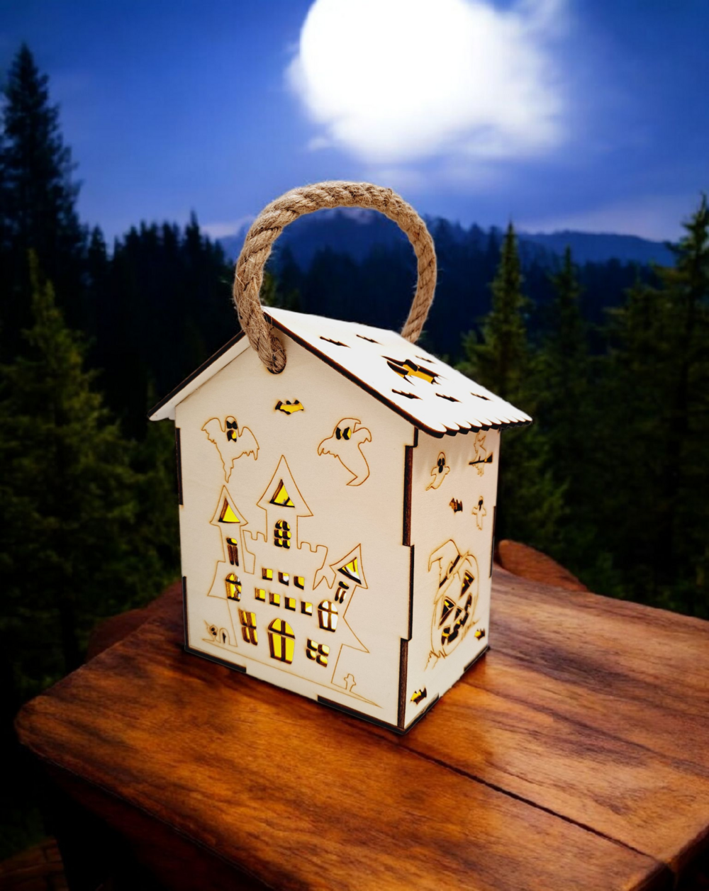 Lampionik na Halloween w kształcie domku to idealna ozdoba dla dzieci, które zbierają cukierki. Dzięki lekkiej konstrukcji z drewnianej sklejki, bezpiecznej lampce tealight na baterie oraz wygodnej rączce, lampionik jest praktyczny i estetyczny. Ażurowe wycięcia z halloweenowymi motywami dodają klimatu i tworzą piękne efekty świetlne, co sprawia, że lampionik staje się wyjątkowym elementem dekoracyjnym na Halloween. Wymiary lampki 12 cm x 9 cm x 16 cm.