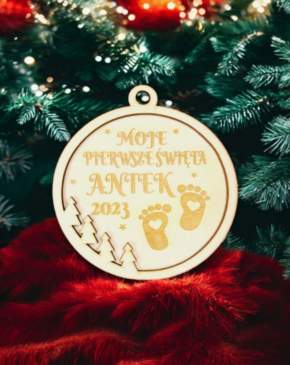 Bombka z grawerem i napisem "Moje pierwsze Święta" oraz imieniem i rokiem to piękna ozdoba, która przypomina o ważnym czasie dla każdego malucha.