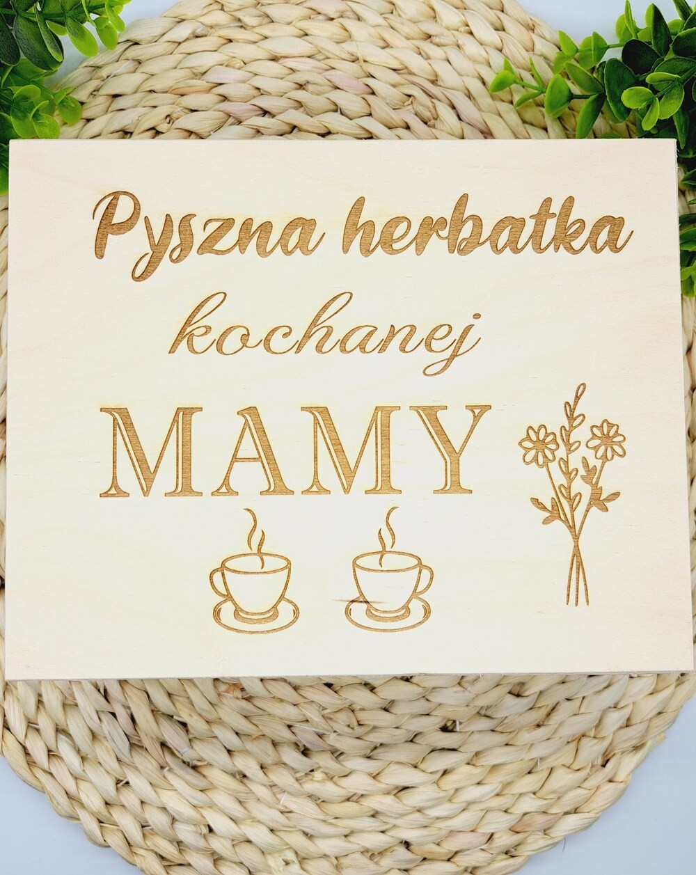 Na wieczku skrzynki znajduje się precyzyjnie wykonany grawer z napisem „Pyszna herbatka Kochanej Mamy”. Napis jest otoczony uroczą grafiką przedstawiającą bukiet kwiatków, co dodaje całości delikatności i elegancji. Obok kwiatów znajdują się dwie filiżanki z parującą herbatą, które podkreślają tematykę upominku i zapraszają do wspólnego relaksu.