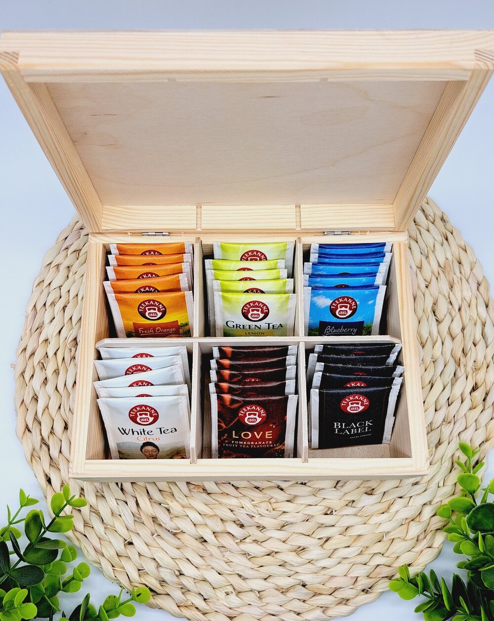 Wnętrze skrzynki podzielone jest na sześć przegródek, a każda z nich zawiera po pięć saszetek herbaty w różnych smakach( razem 30 sztuk dobieranych losowo). Taka różnorodność pozwala mamie na wybór herbaty w zależności od nastroju czy okazji, co czyni skrzynkę nie tylko piękną, ale i funkcjonalną.