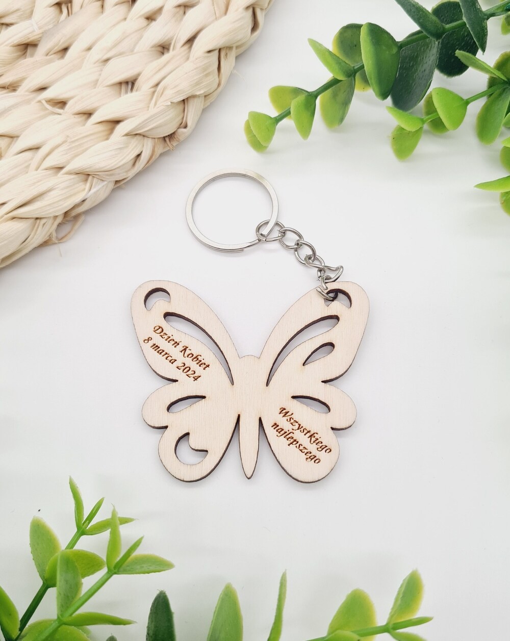 Na breloku znajduje się grawer, który można spersonalizować według własnych potrzeb. Na przykład na prezentowanym zdjęciu widnieje napis: "Dzień Kobiet 8 marca 2024" oraz "Wszystkiego najlepszego". Grawer można jednak dowolnie zmienić, pamiętając, aby nie był zbyt długi, ponieważ ograniczona powierzchnia motylka może nie pomieścić zbyt rozbudowanego tekstu.