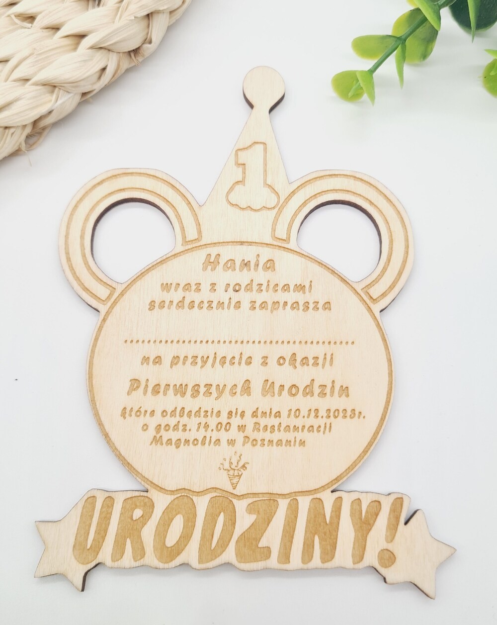 Nie zapomnij zapisać swojej personalizacji, aby móc dodać ją do koszykaDrewniane zaproszenia w kształcie głowy misia to uroczy i oryginalny sposób na zaproszenie gości na 1 urodziny dziecka. Wykonane z naturalnej drewnianej sklejki, te zaproszenia łączą w sobie elegancję i rustykalny urok, a jednocześnie są wyrazem dbałości o szczegóły.