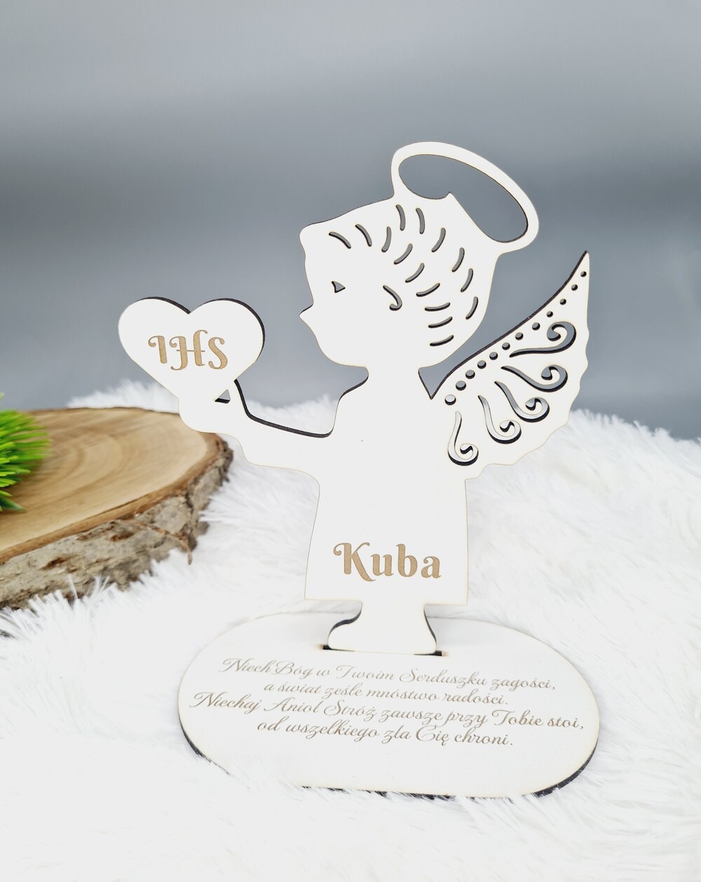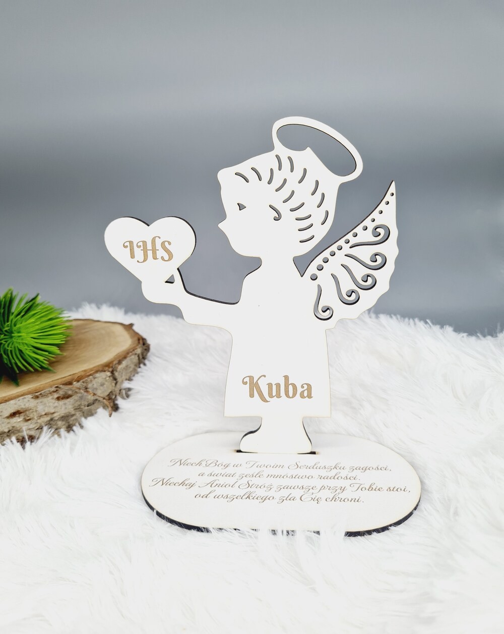 Nie zapomnij zapisać swojej personalizacji, aby móc dodać ją do koszykaAniołek wykonany z białej płyty HDF to elegancki i symboliczny prezent, szczególnie dedykowany dla chłopca. Przedstawia postać aniołka chłopca, który ma ażurowe wzory na skrzydełkach i we włosach, co dodaje mu subtelności i wyjątkowego charakteru. W rękach trzyma serduszko z napisem "IHS," które symbolizuje wiarę i duchowość.