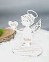 Aniołek z ażurowym akcentem stojący na podstawce, na której są życzenia to miły drobny upominek z okazji Pierwszej Komunii Świętej. Wykonany z białej płyty HDF pięknie się prezentuje.