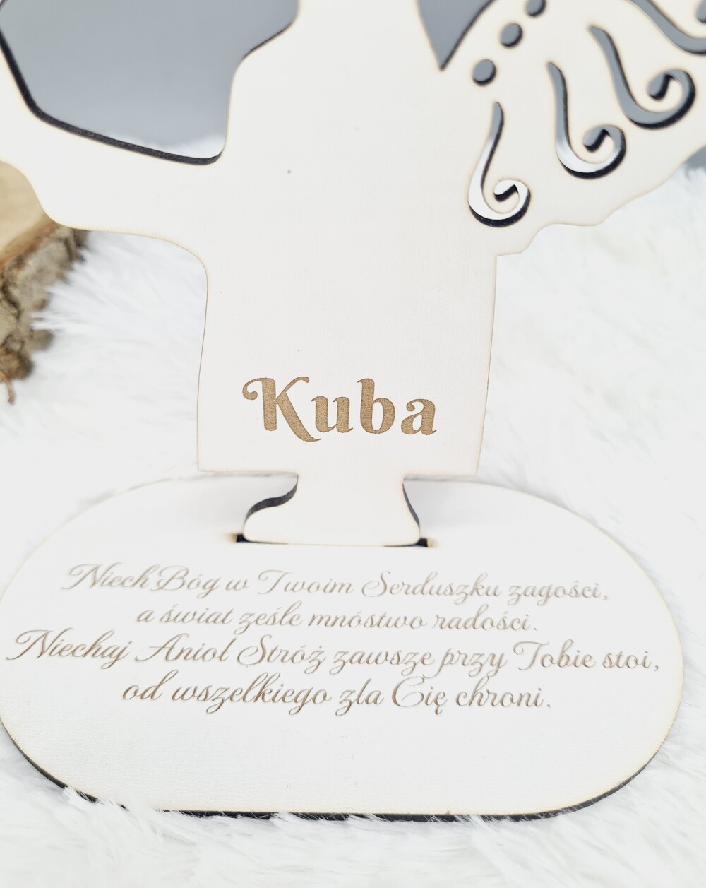Na sukience aniołka znajduje się imię dziecka, co sprawia, że jest to personalizowany upominek, pełen osobistego wymiaru. Aniołek stoi na eleganckiej podstawce, na której umieszczone są życzenia: