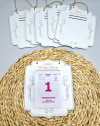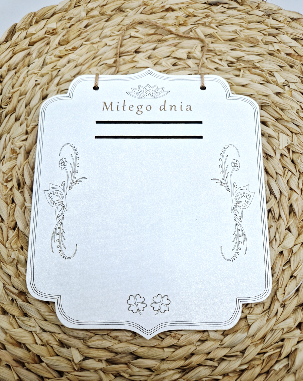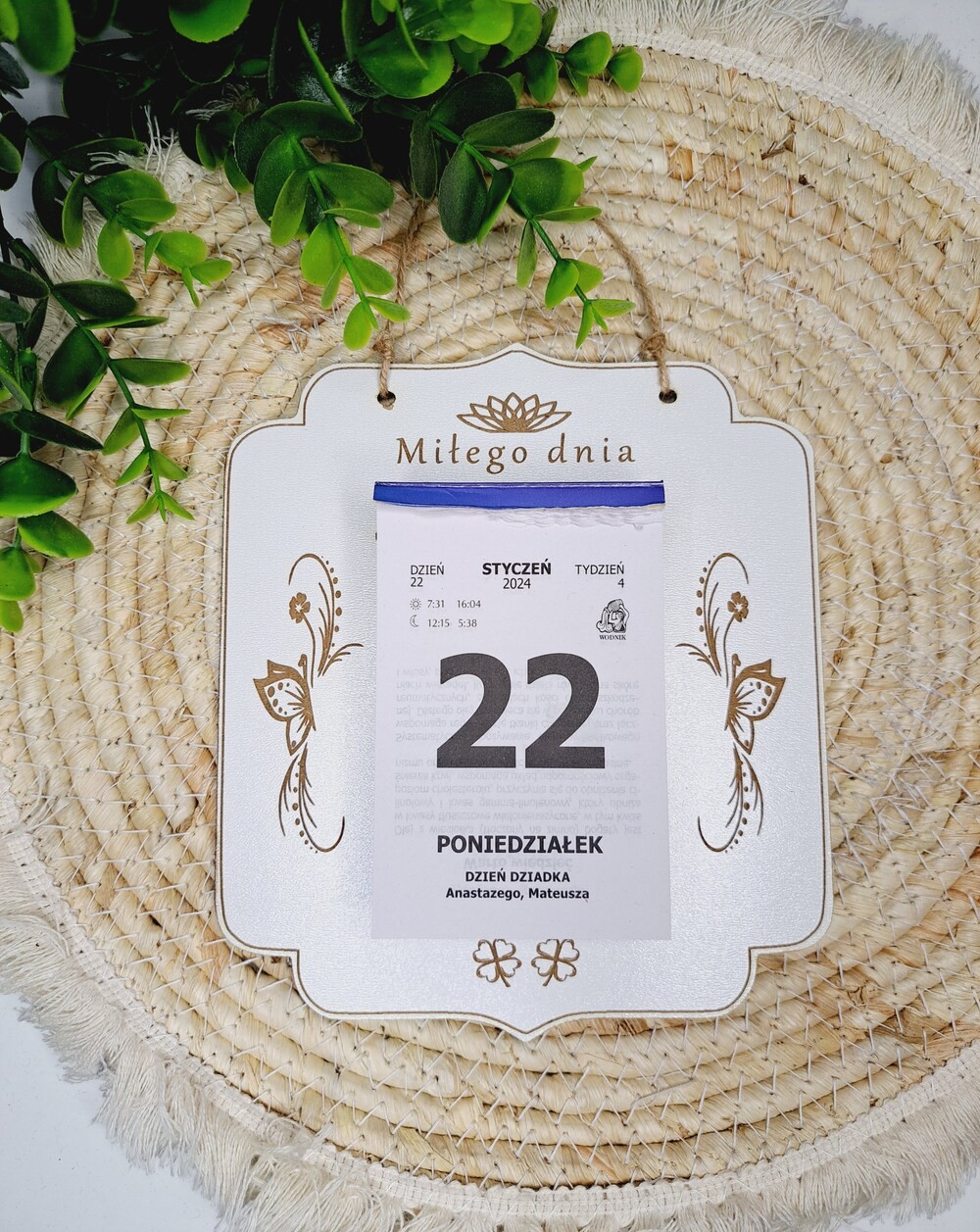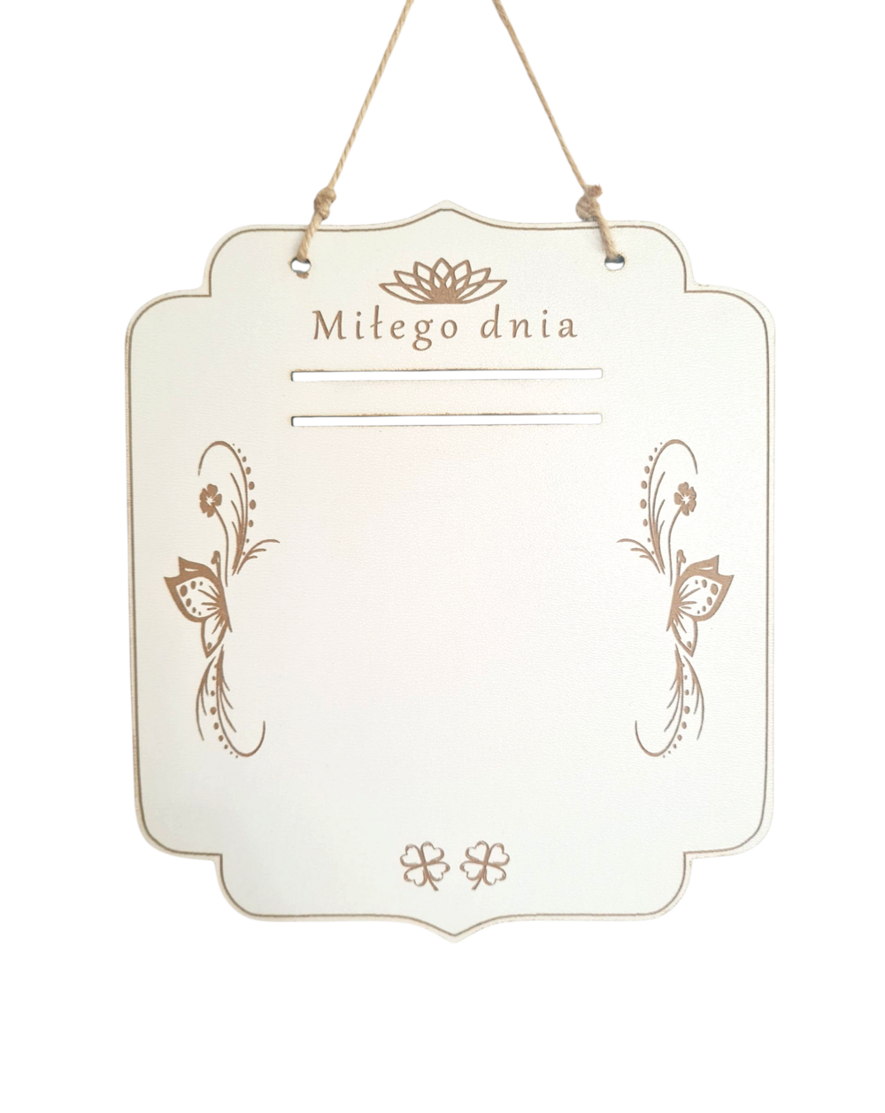 Biała, stylowa klapka pod kalendarz wykonana jest z płyty HDF o wymiarach 19 cm x 16 cm. Klapka jest sprzedawana bez kalendarza. Jej elegancki design wzbogacony jest o delikatne motylki oraz subtelny wzór umieszczony u góry. W centralnej części klapki znajduje się wygrawerowany napis „Miłego dnia”, dodający osobistego akcentu. Na górze klapki wycięto dwie precyzyjne dziurki, przeznaczone do przełożenia kalendarza. Całość charakteryzuje się prostotą i urokiem, idealnie komponując się z różnymi stylami wnętrz.