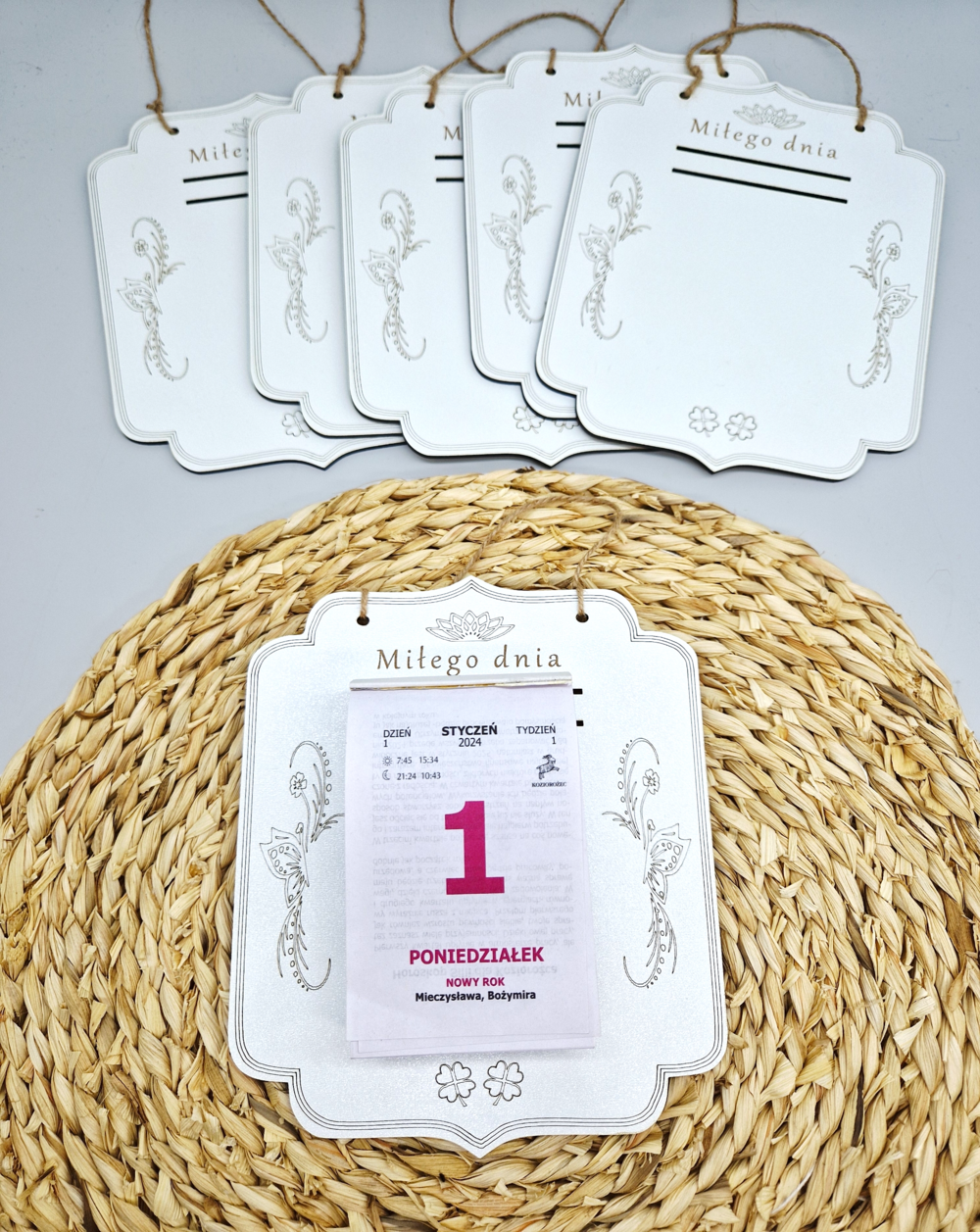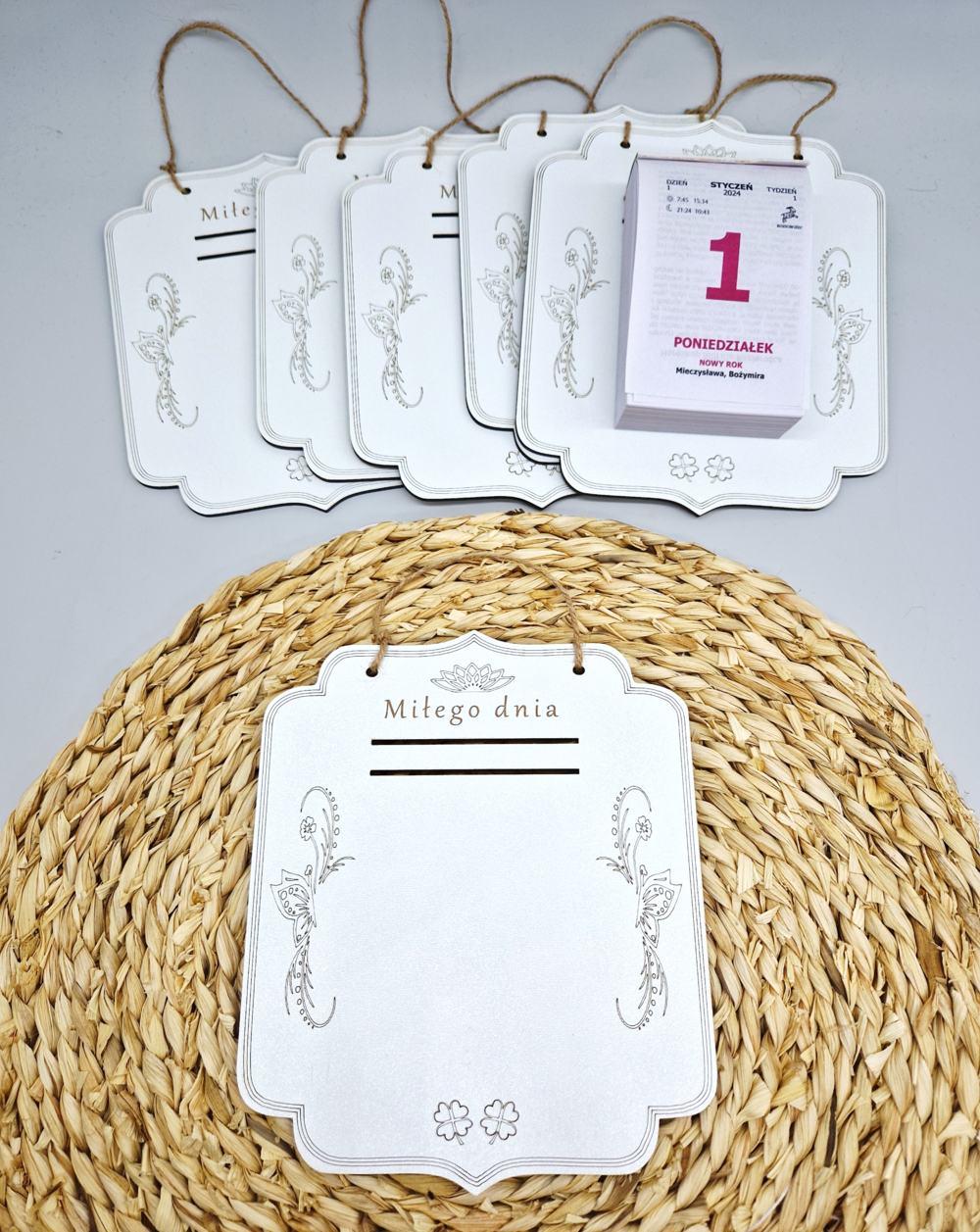 Tabliczka pod kalendarz wykonana z białej płyty HDF wzbogacona o elegancki wygrawerowany wzór wkomponuje się w niejeden styl. Nadaje się zarówno jako drobny upominek na różne okazje.