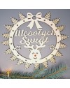 Ozdoba świąteczna w postaci obręczy wykonanej z naturalnej drewnianej sklejki o średnicy około 30 cm. Na obręczy znajdują się urocze, drobne choinki, wycięte z tej samej sklejki, które tworzą świąteczny nastrój. W centralnej części obręczy widnieje napis "Wesołych Świąt", a tuż nad nim znajduje się stylizowana głowa renifera z charakterystycznym czerwonym noskiem. Ta ozdoba jest idealna do zawieszenia na drzwiach lub nad kominkiem, dodając przytulnej, świątecznej atmosfery do każdego wnętrza.