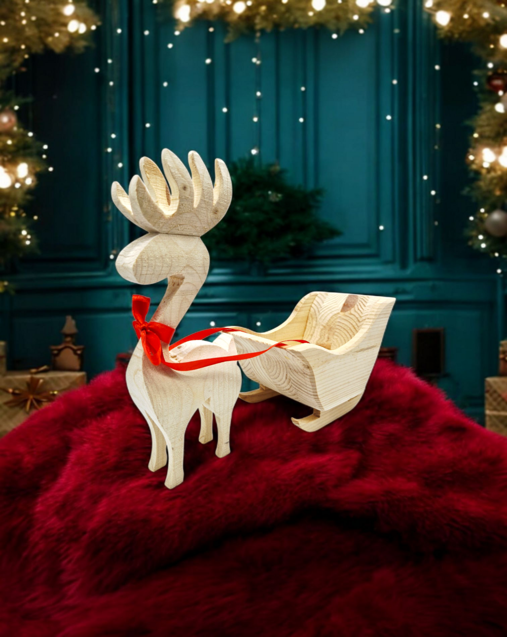 Drewniany renifer i sanie to elegancka i stylowa ozdoba, która doskonale wpisuje się w świąteczny klimat Bożego Narodzenia.