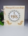 Drewniana kartka wykonana z naturalnej sklejki wzbogacona o białą hostię to oryginalna pamiątka na Komunię Świętą.