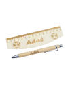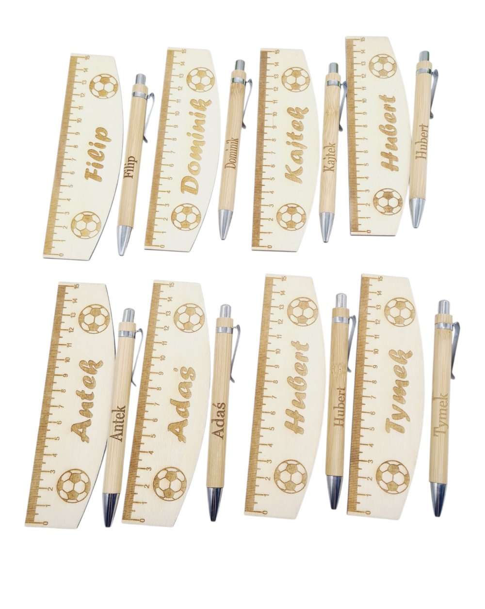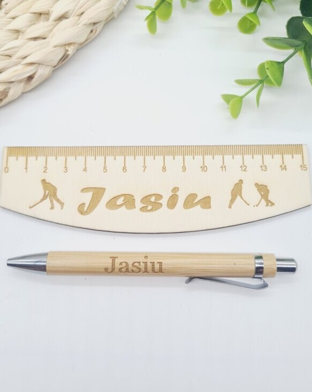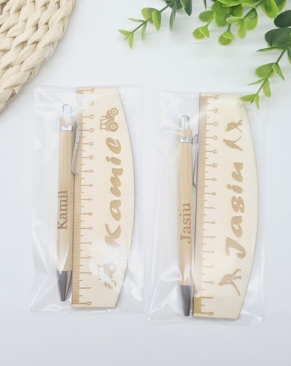 Nie zapomnij zapisać swojej personalizacji, aby móc dodać ją do koszykaDrewniany zestaw składający się z linijki i długopisu to elegancki i praktyczny upominek, który idealnie nadaje się na różne okazje, takie jak zakończenie roku szkolnego, urodziny, czy jako pamiątka z ważnych chwil. Oto szczegółowy opis zestawu: