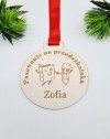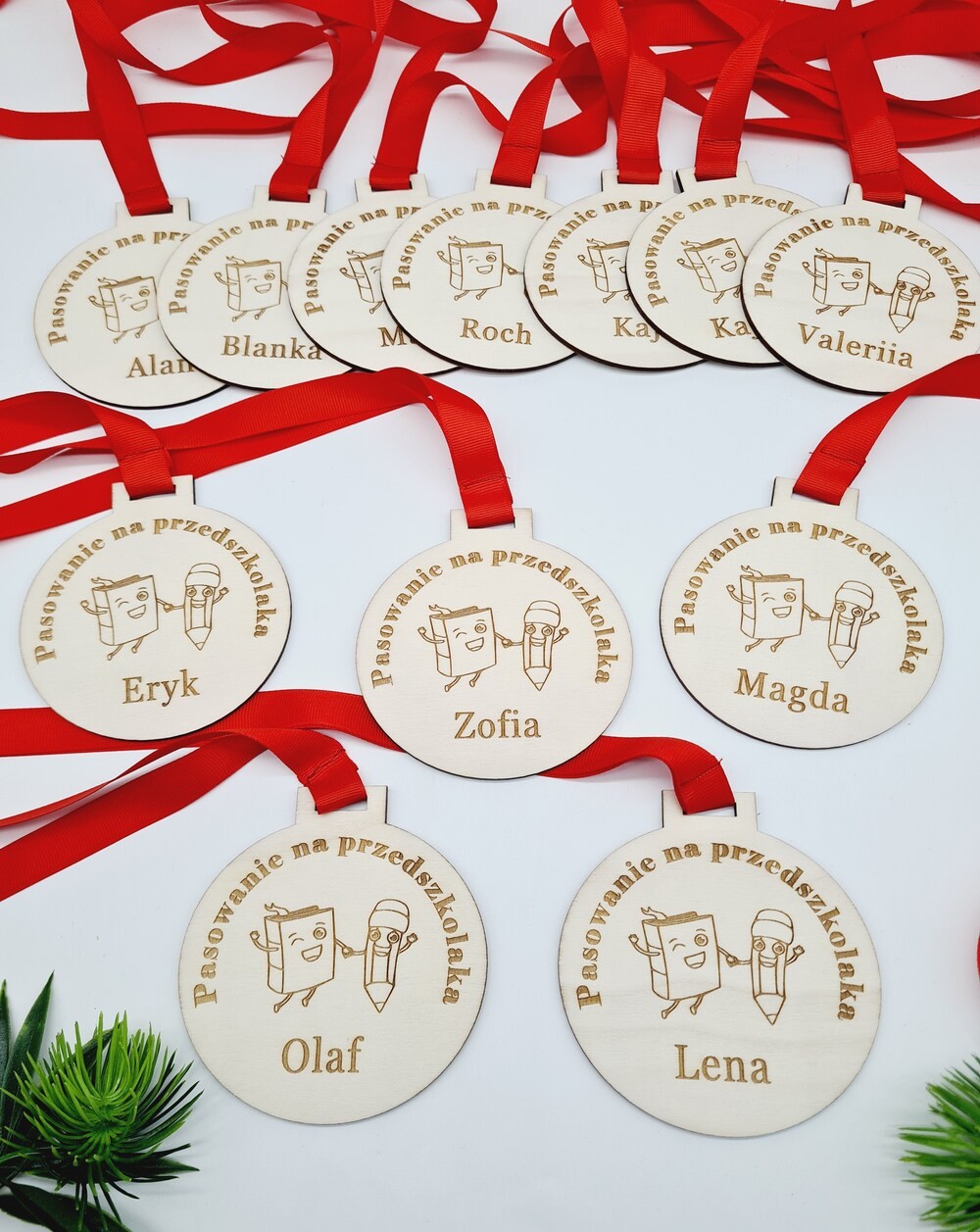 Medal jest zawieszony na czerwonej taśmie, która została starannie przyszyta. Taśma ta nie tylko dodaje wyrazistości, kontrastując z naturalnym drewnem, ale także zapewnia trwałość medalu. Całość prezentuje się elegancko i uroczo, stanowiąc idealną pamiątkę dla każdego dziecka rozpoczynającego swoją edukacyjną przygodę w przedszkolu.