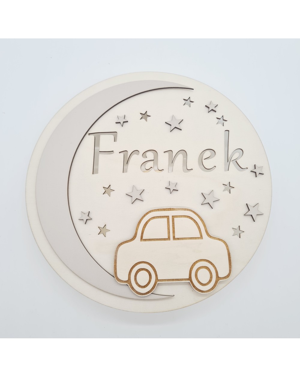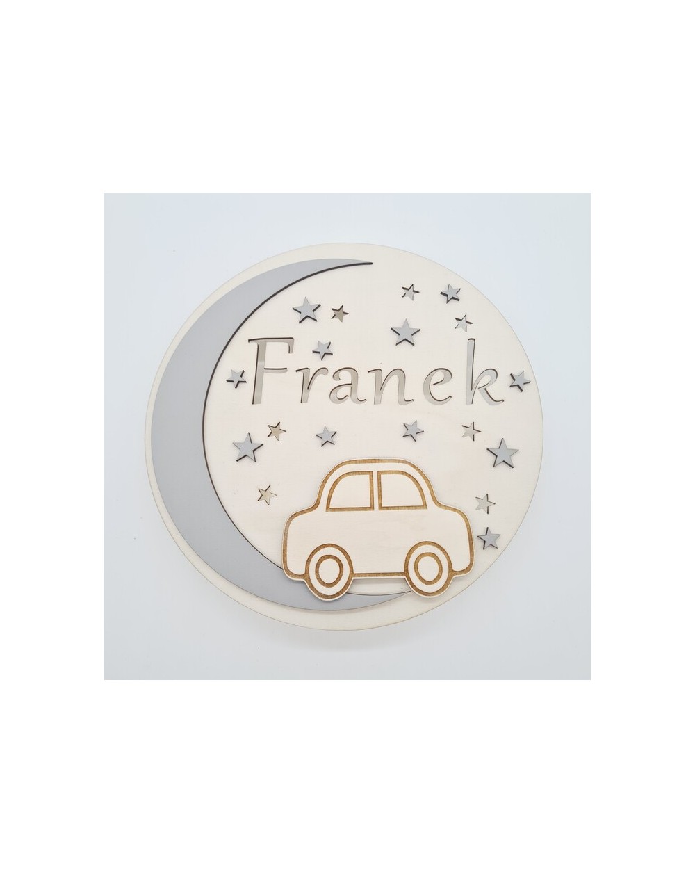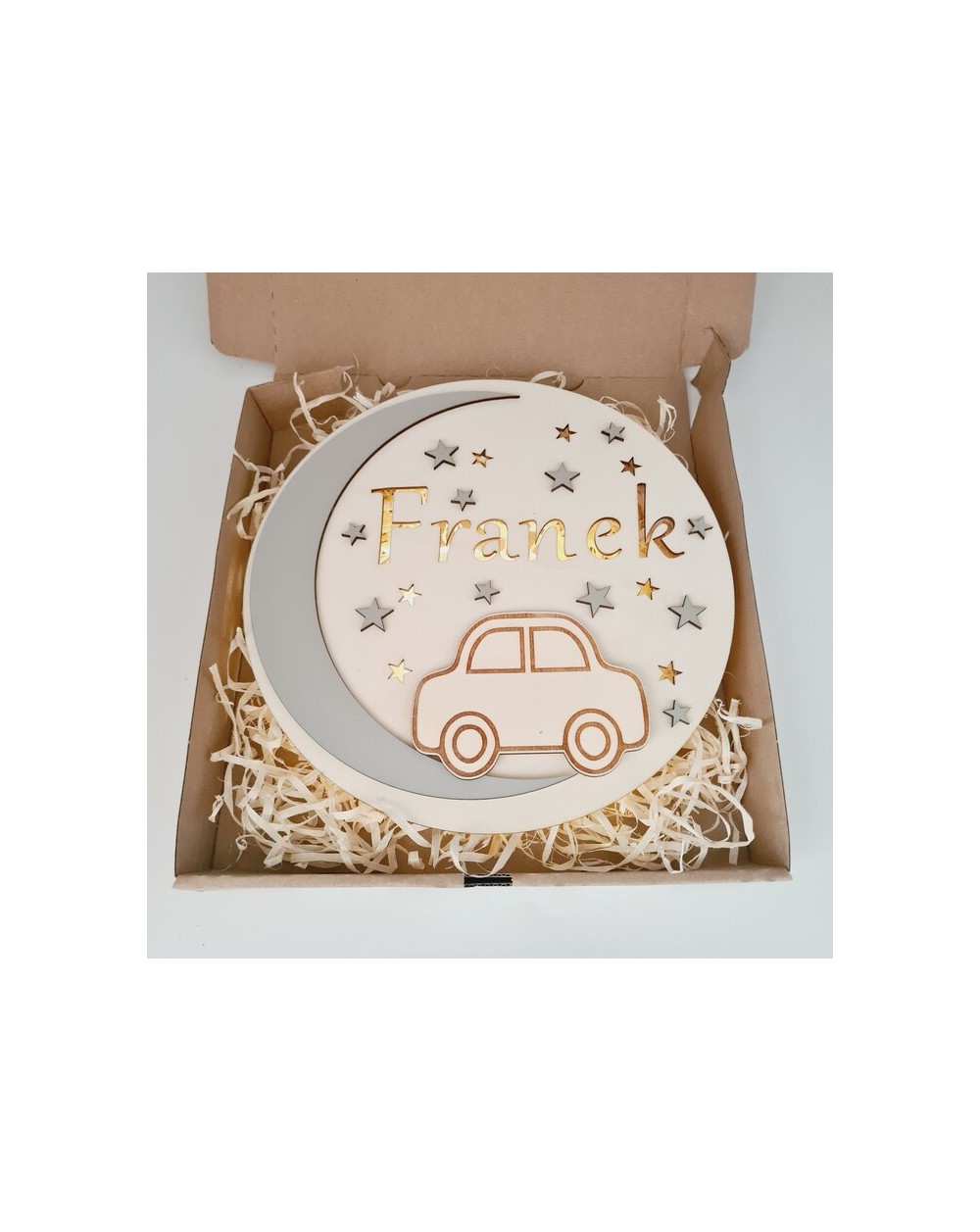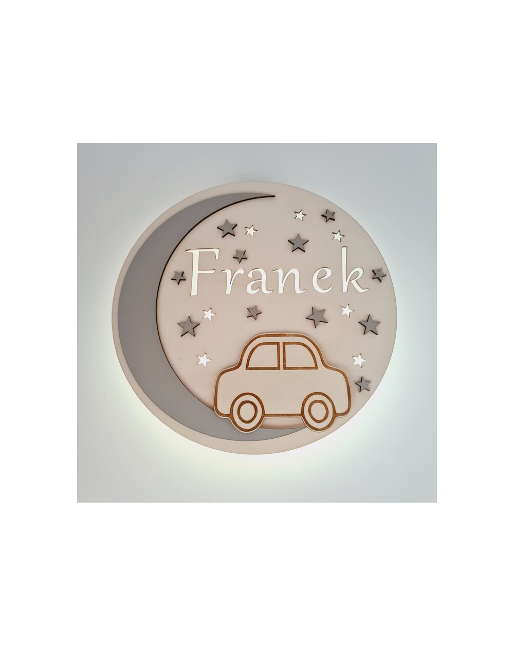 Nie zapomnij zapisać swojej personalizacji, aby móc dodać ją do koszykaLampka nocna dla dzieci wykonana jest z wysokiej jakości drewnianej sklejki, charakteryzującej się trwałością i estetycznym wyglądem. Na jej przedniej części znajduje się uroczy motyw samochodzika oraz imię dziecka, co nadaje jej wyjątkowego, osobistego charakteru.