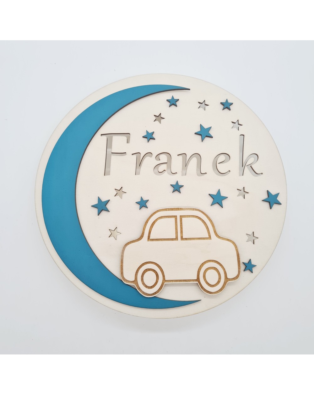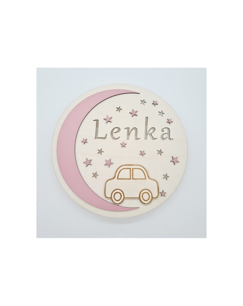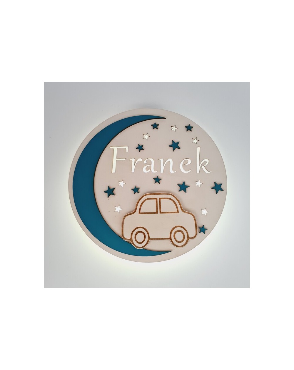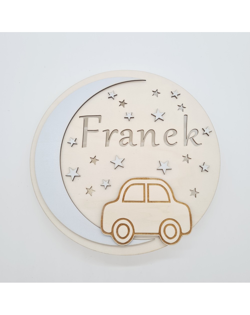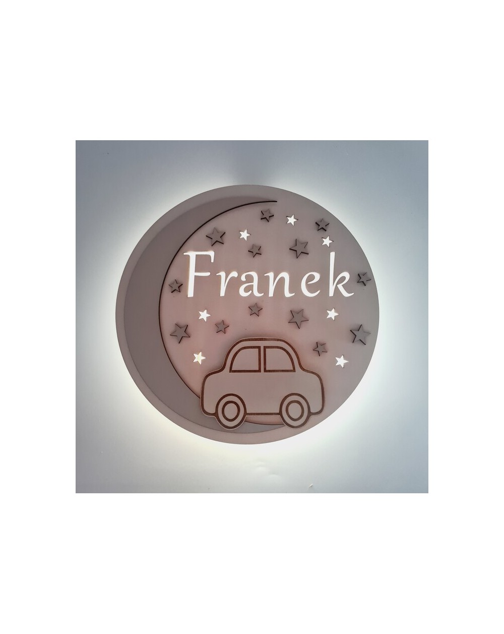 Nie zapomnij zapisać swojej personalizacji, aby móc dodać ją do koszykaLampka nocna dla dzieci wykonana jest z wysokiej jakości drewnianej sklejki, charakteryzującej się trwałością i estetycznym wyglądem. Na jej przedniej części znajduje się uroczy motyw samochodzika oraz imię dziecka, co nadaje jej wyjątkowego, osobistego charakteru.