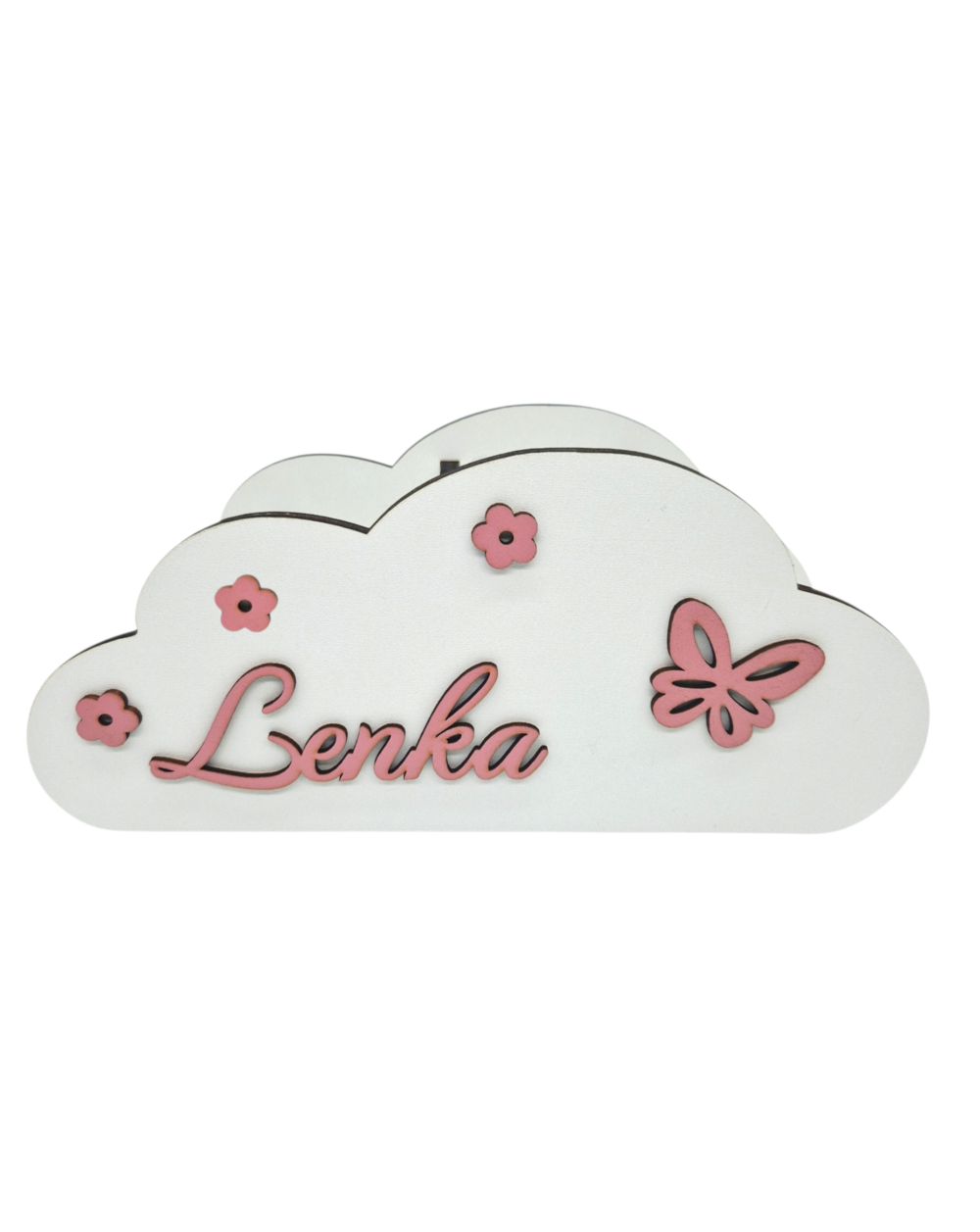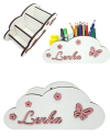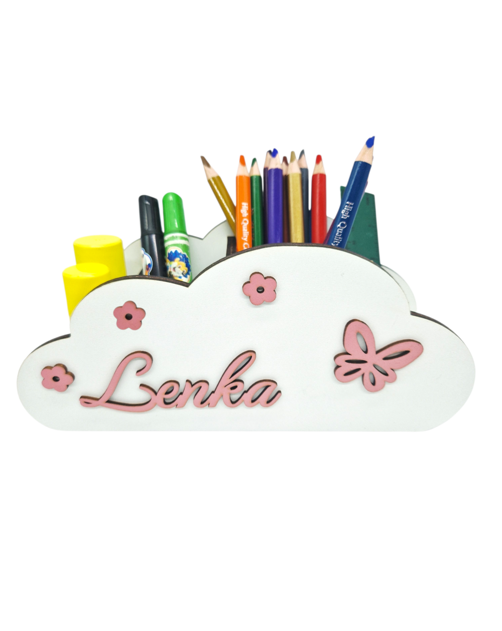 Wewnątrz znajdują się przegródki, idealne do uporządkowania długopisów, ołówków, linijek czy innych drobnych przedmiotów. Chmurka jest ozdobiona delikatnymi kwiatkami i motylkiem, co nadaje jej uroku i sprawia, że doskonale wpasowuje się w dziecięcy klimat. Dodatkowo, istnieje możliwość personalizacji organizera poprzez umieszczenie imienia dziecka, co czyni go unikalnym i osobistym elementem wyposażenia pokoju.