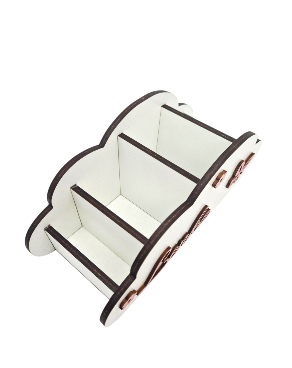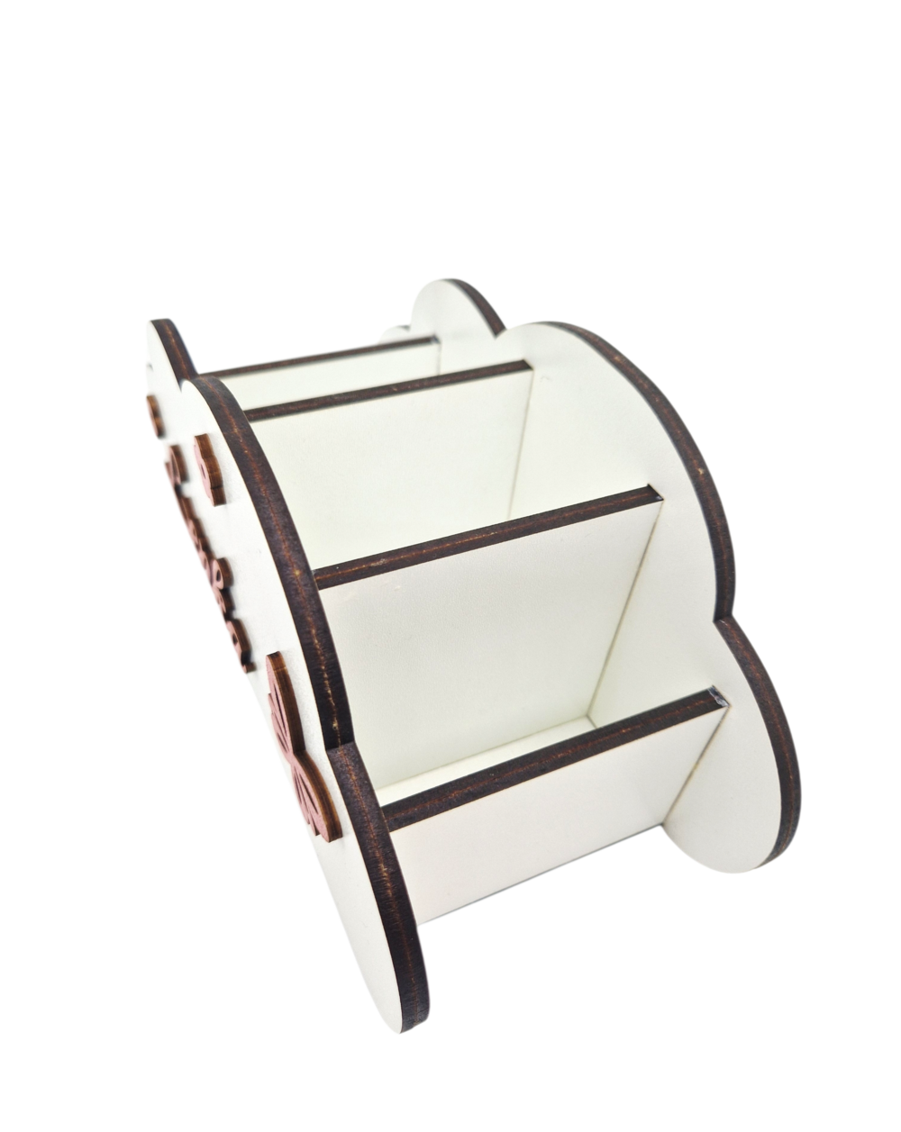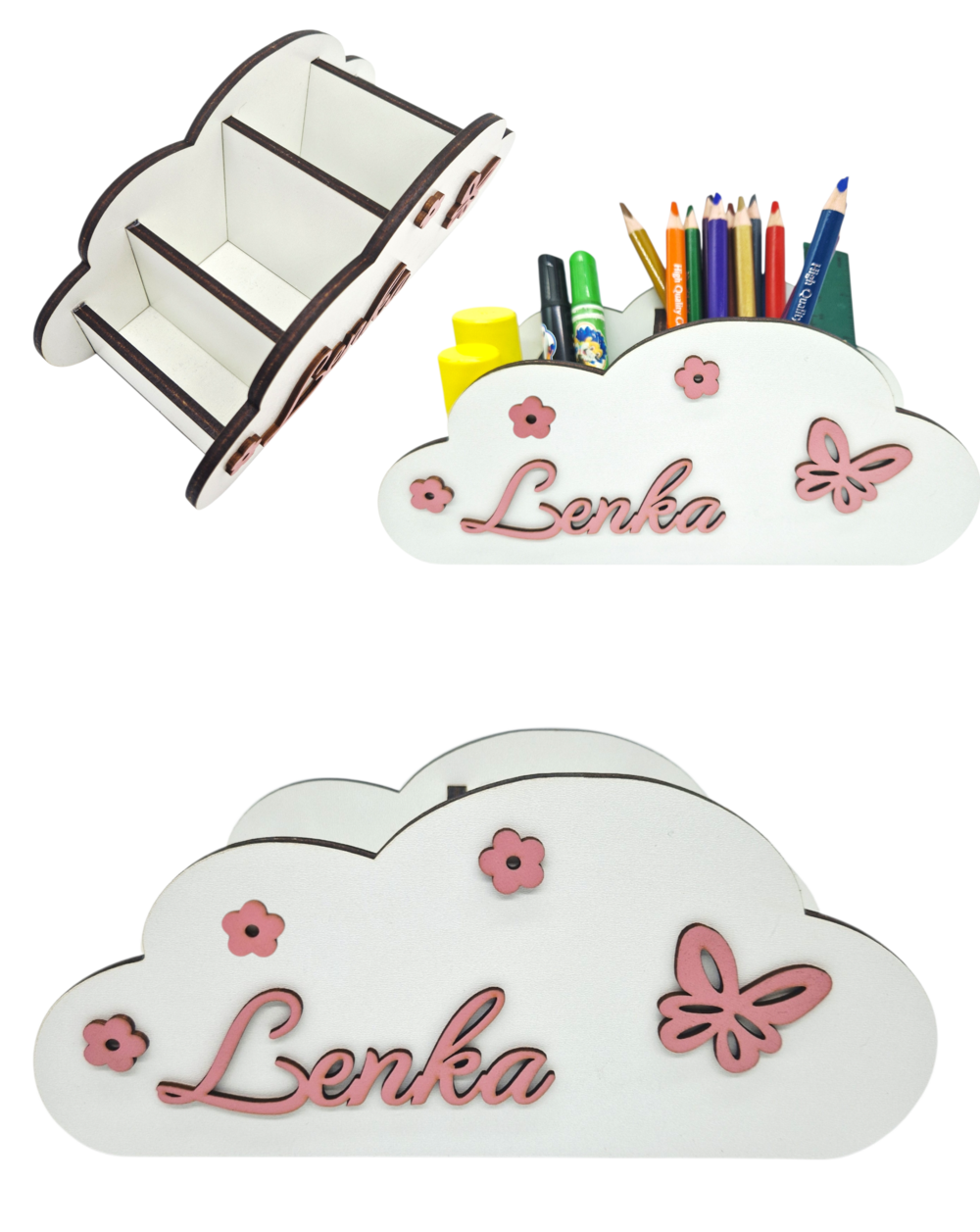 Nie zapomnij zapisać swojej personalizacji, aby móc dodać ją do koszykaOrganizer na przybory szkolne w kształcie chmurki to elegancki i funkcjonalny dodatek na biurko dziecka. Wykonany z wysokiej jakości płyty HDF, zapewnia trwałość i estetykę, dzięki precyzyjnemu wycięciu. Organizer ma wymiary 23,5 cm szerokości, 11,5 cm wysokości oraz 9,5 cm głębokości, co sprawia, że jest kompaktowy, ale jednocześnie oferuje wystarczająco dużo miejsca na przechowywanie przyborów.