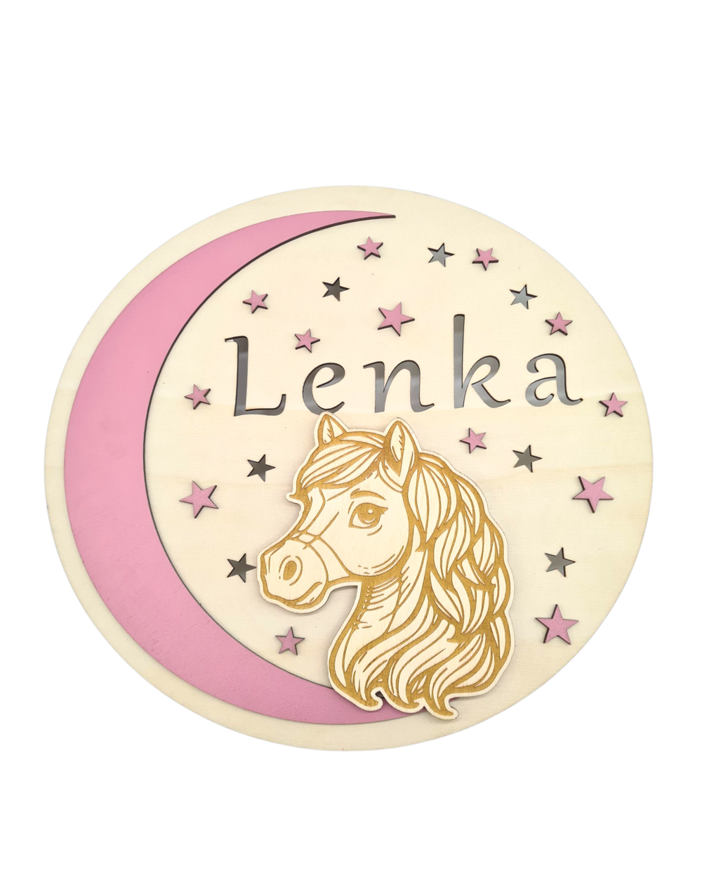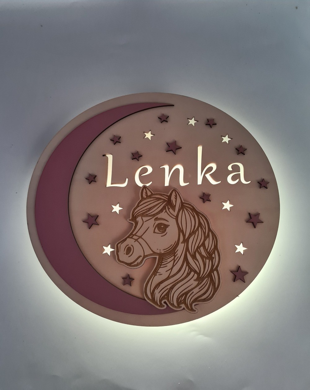 Nie zapomnij zapisać swojej personalizacji, aby móc dodać ją do koszykaLampka wykonana z drewnianej sklejki to wyjątkowa ozdoba do dziecięcego pokoju. Jej projekt wzbogacony jest o kolorowe elementy przedstawiające księżyc i gwiazdki, a centralnym punktem jest obrazek konia. Lampka posiada funkcję dotykowego włącznika – wystarczy nadusić na konia, aby włączyć delikatne, przytulne światło, które tworzy spokojną atmosferę, idealną do zasypiania. Dzięki zasilaniu na baterie, lampka jest bezpieczna dla dzieci i nie wymaga żadnych kabli. Jej wymiary to około 25 cm, co czyni ją kompaktową i idealną do dziecięcego pokoju. Każda lampka zapakowana jest w elegancki kartonik, dzięki czemu doskonale nadaje się na prezent, gotowy do wręczenia. Elementy doklejone na lampce - księżyc i gwiazdki mogą być w sześciu różnych kolorach. Przy składaniu zamówienia należy podać kolor, który się wybiera.