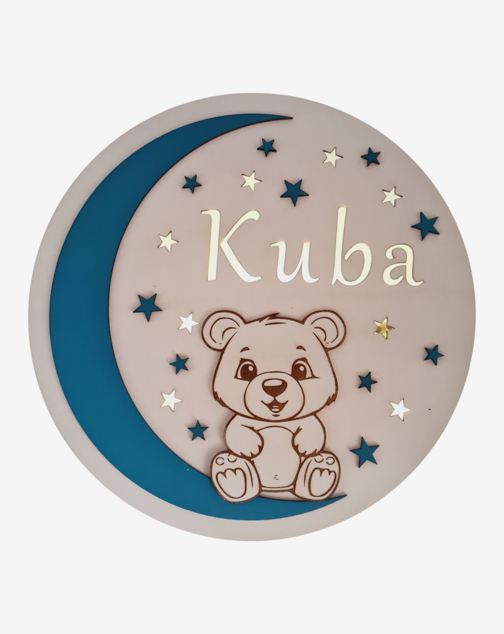 Nie zapomnij zapisać swojej personalizacji, aby móc dodać ją do koszykaLampka nocna wykonana z drewnianej sklejki ma uroczy, dziecięcy design. Centralnym punktem lampki jest urokliwy obrazek misia, który dodaje jej ciepła i przytulności. Po lewej stronie znajduje się kolorowy księżyc, dostępny w sześciu różnych odcieniach. Przy zamawianiu lampki można wybrać kolor księżyca, aby dopasować go do wystroju pokoju.
