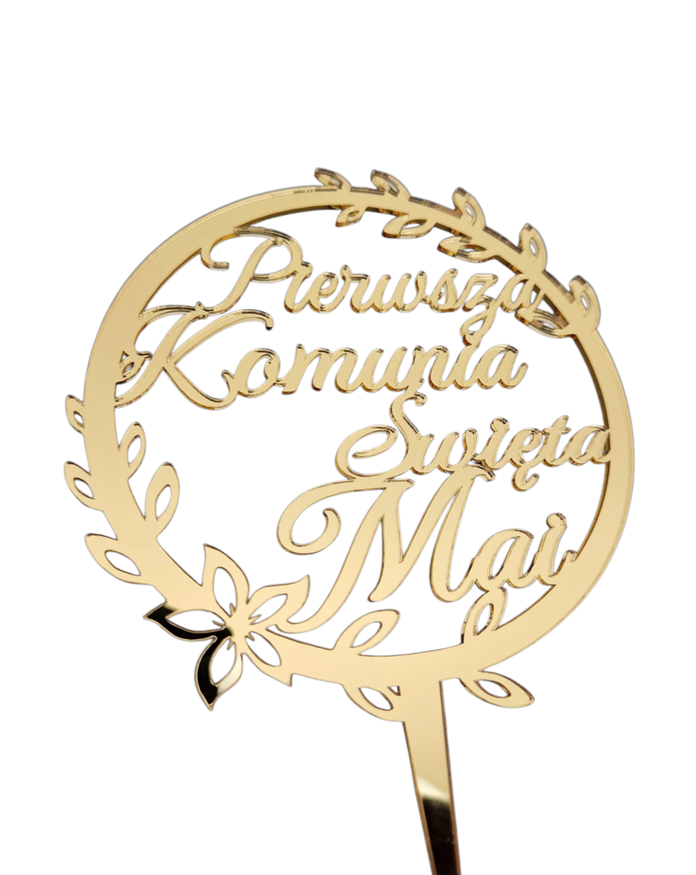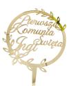 Personalizowany Topper "Wianek" – Elegancja na Tort Komunijny! Podkreśl wyjątkowość Pierwszej Komunii Świętej dzięki stylowemu topperowi w kształcie subtelnej obręczy z motywem roślinnym. Personalizowany imieniem Twojego dziecka, dostępny w wersji złotej, srebrnej, białej lub naturalnego drewna. Idealne proporcje (14 cm średnicy) sprawią, że tort nabierze lekkości i luksusowego charakteru. Wybierz swój wariant i stwórz piękną pamiątkę