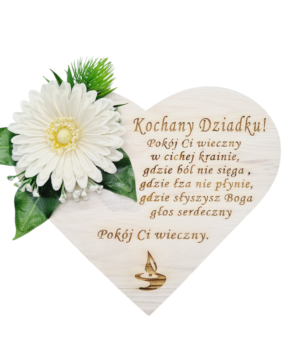 Nie zapomnij zapisać swojej personalizacji, aby móc dodać ją do koszykaStroik na cmentarz w formie drewnianego serca to wyjątkowy sposób wyrażenia szacunku i pamięci dla ukochanej osoby, takiej jak babcia, dziadek, mama, tata czy ciocia. Serce wykonane jest z drewna i pomalowane na biało, co symbolizuje czystość, spokój i nadzieję. Zostało osadzone na podstawce, zapewniającej stabilność dekoracji, dzięki czemu stroik można bezpiecznie ustawić na grobie. Na górze serca znajduje się dedykacja dla zmarłej osoby, a poniżej wygrawerowany jest wzruszający wierszyk: