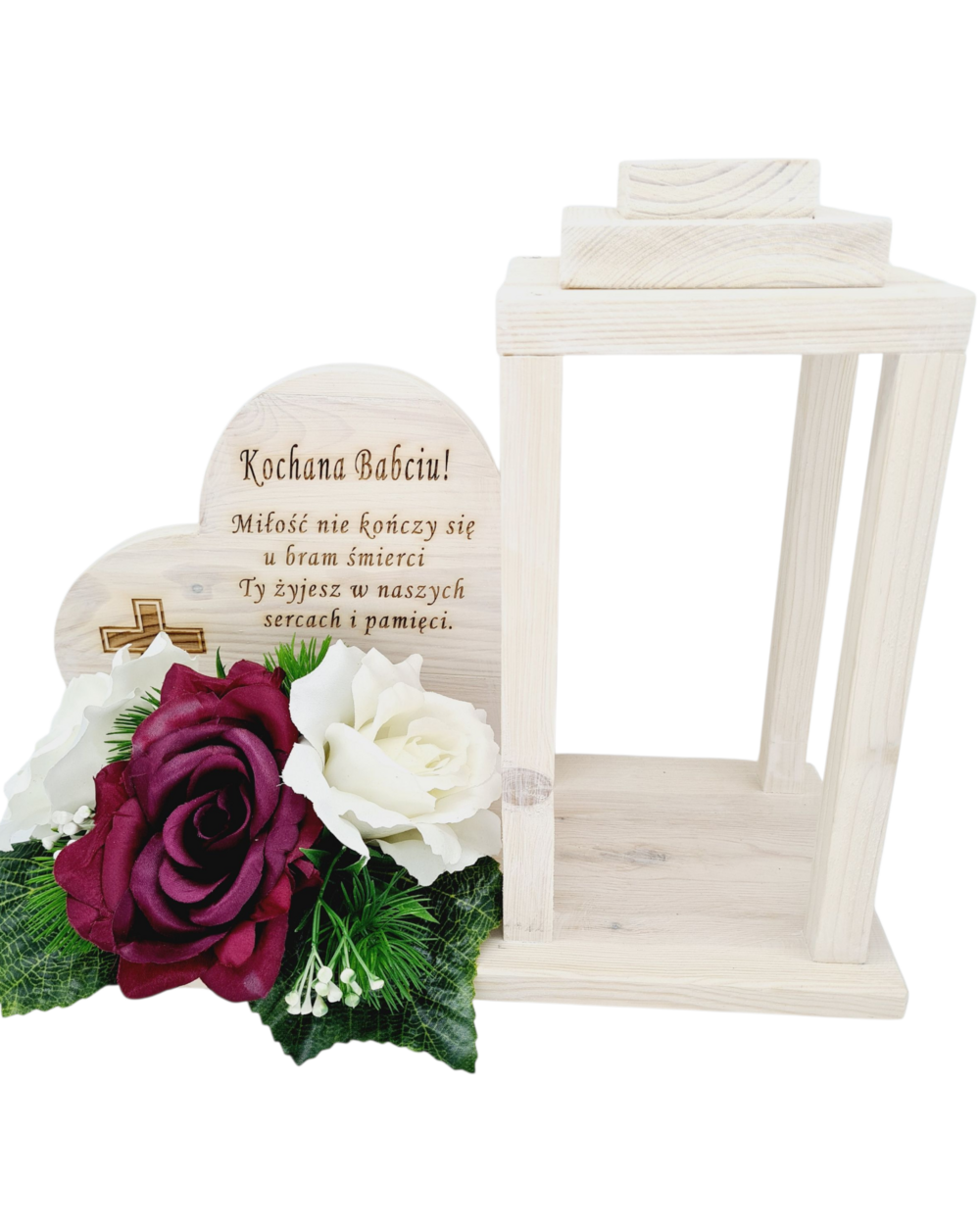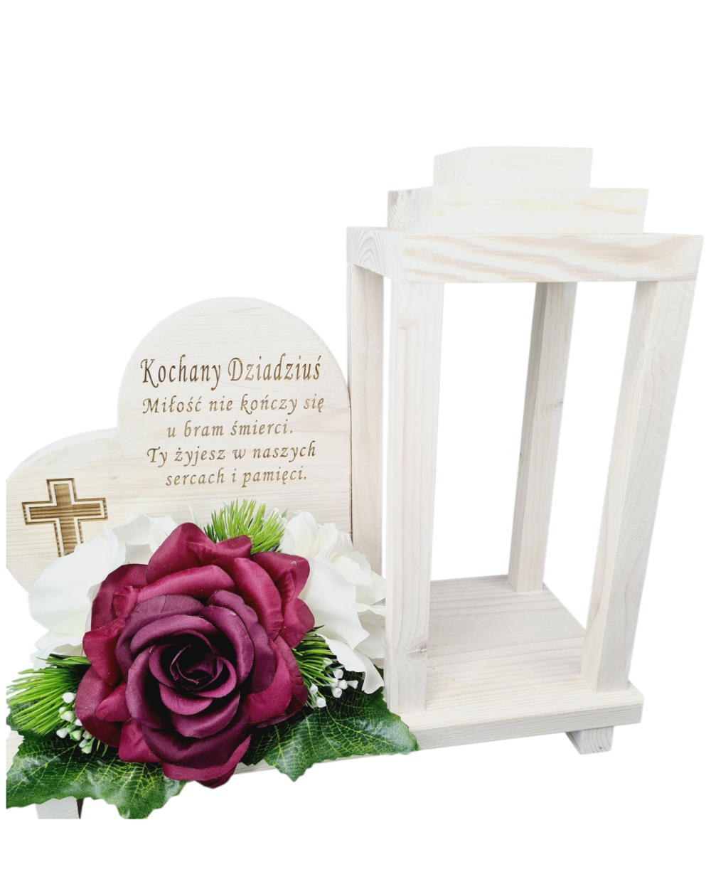 Po prawej stronie stroika znajduje się stylowy lampion, przeznaczony na umieszczenie znicza, który po zapaleniu może symbolizować pamięć, modlitwę i wieczne światło dla ukochanej osoby. Lampion nie tylko dodaje stroikowi funkcjonalności, ale również elegancji, tworząc piękną i pełną wdzięczności formę upamiętnienia. Stroik stanowi doskonałe połączenie delikatnych kwiatów, drewna i światła, oferując spokojną, symboliczną formę hołdu dla zmarłego.