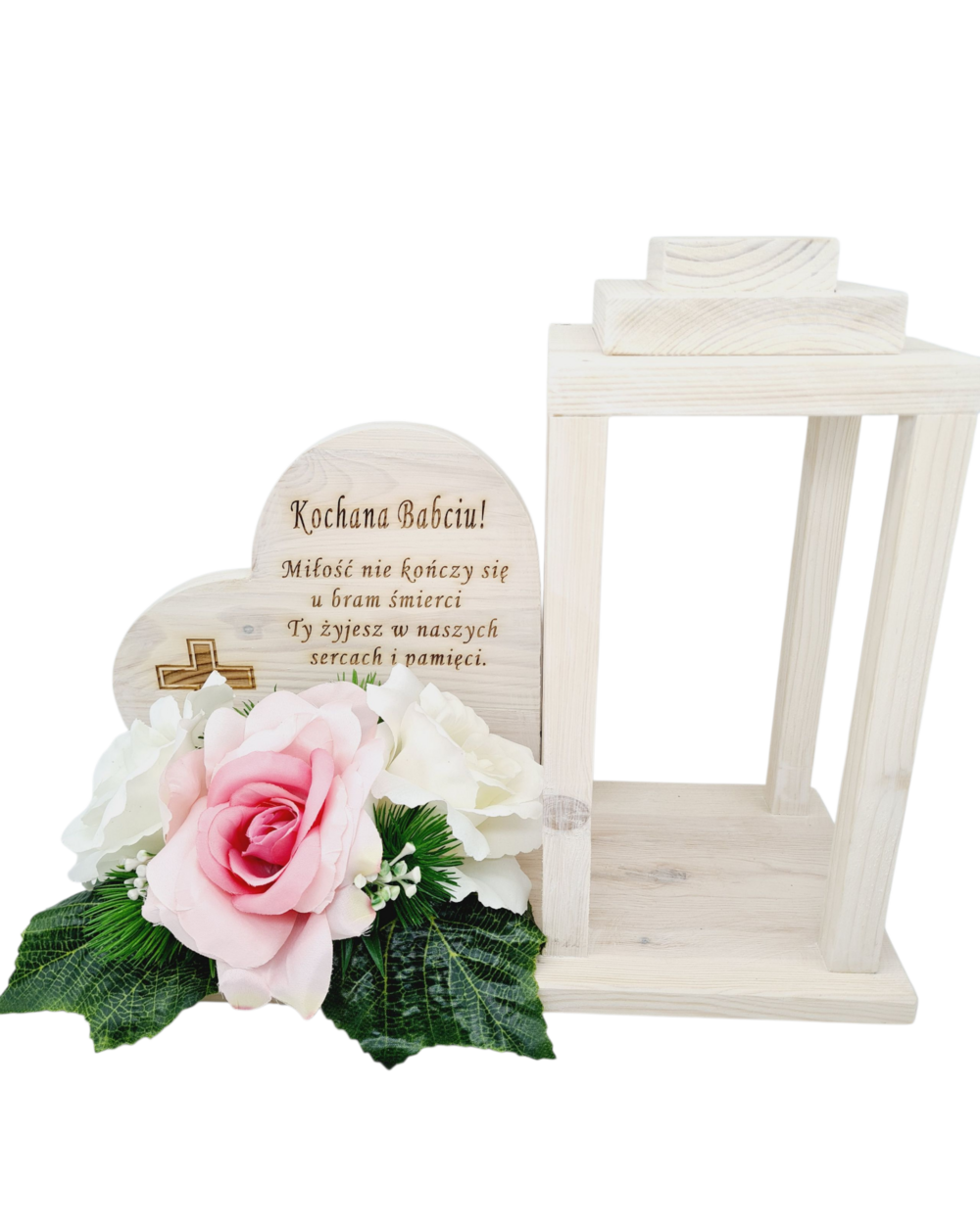 Lampion, który znajduje się w kompozycji, jest gustownie udekorowany różami, symbolizującymi miłość i pamięć, oraz zielonymi dodatkami, które wprowadzają naturalny element i świeżość. Kwiaty oraz zieleń harmonizują z drewnianą strukturą serca, tworząc spójną i estetyczną całość.