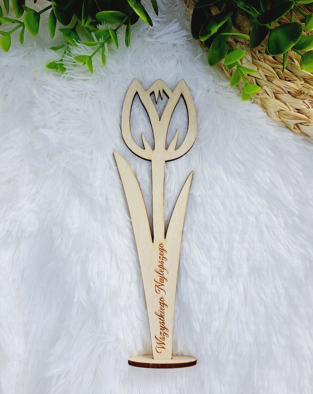 Drewniany kwiatek w kształcie ażurowego tulipana to miły, drobny upominek na różne okazje.