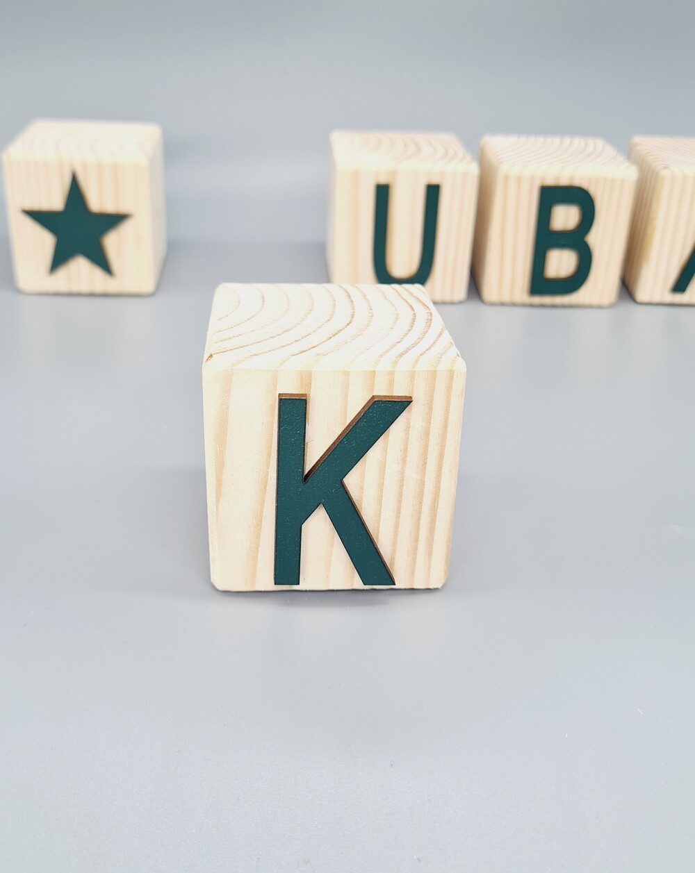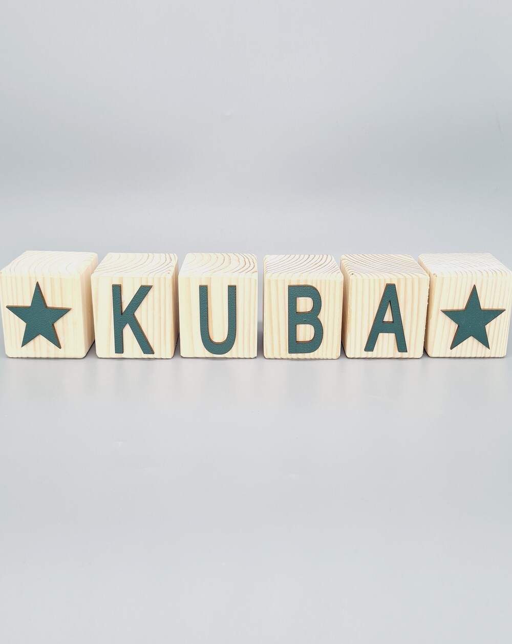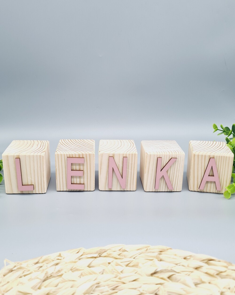 Nie zapomnij zapisać swojej personalizacji, aby móc dodać ją do koszykaDrewniane klocki wykonane z naturalnego drewna sosnowego to urocza i praktyczna ozdoba, która doskonale sprawdzi się w pokoju dziecięcym. Każdy klocek ma wymiar 5,5 cm x 5,5 cm. Na powierzchni każdego klocka znajdują się starannie przymocowane kolorowe literki, które można dowolnie układać, tworząc różne napisy, na przykład imię dziecka. Dzięki temu klocki stają się personalizowaną dekoracją, dodając ciepła i uroku każdemu dziecięcemu wnętrzu. Klocki są minimalistyczne, a jednocześnie estetyczne, pasujące zarówno do klasycznych, jak i nowoczesnych aranżacji pokoju dziecięcego.