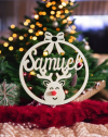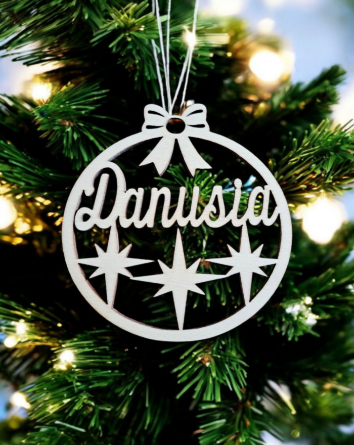 Bombka jest personalizowana, co oznacza, że nad reniferem widnieje imię osoby, dla której jest ona przeznaczona. Tekst jest wyraźnie wycięty laserowo, nadając całości osobisty, unikalny charakter. Bombka posiada również małą dziurkę u góry, dzięki której można zawiesić ją na choinkę.