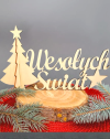 Wymiary dekoracji to 34 cm szerokości i 18 cm wysokości, co sprawia, że napis jest dobrze widoczny i stanowi centralny element dekoracyjny. Z lewej strony do napisu doczepiona jest piękna choinka, która wprowadza dodatkowy świąteczny akcent. Jej delikatne detale podkreślają radosny charakter ozdoby.